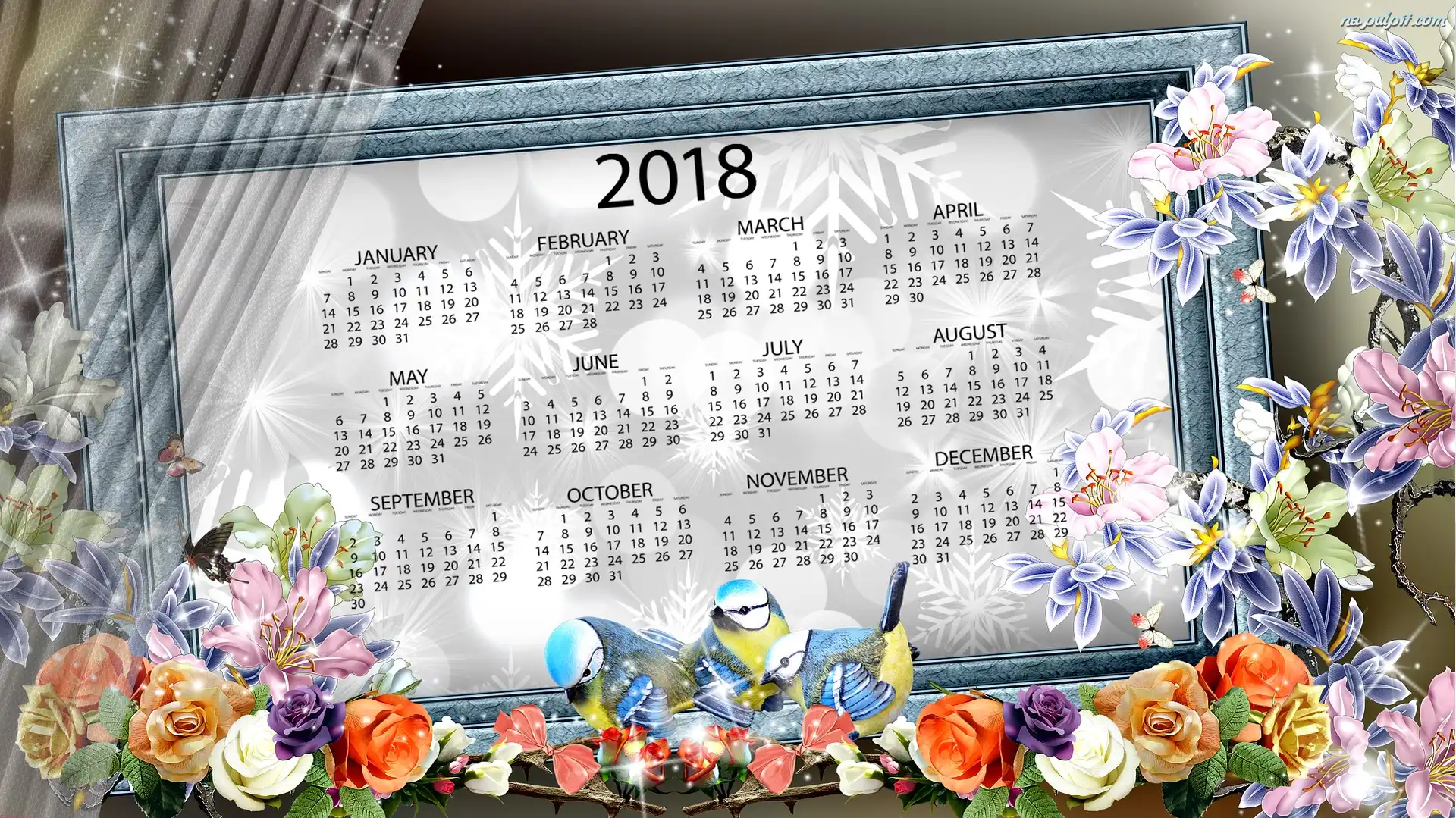 2018, Ptaszki, Kwiaty, Ramka, Kalendarz