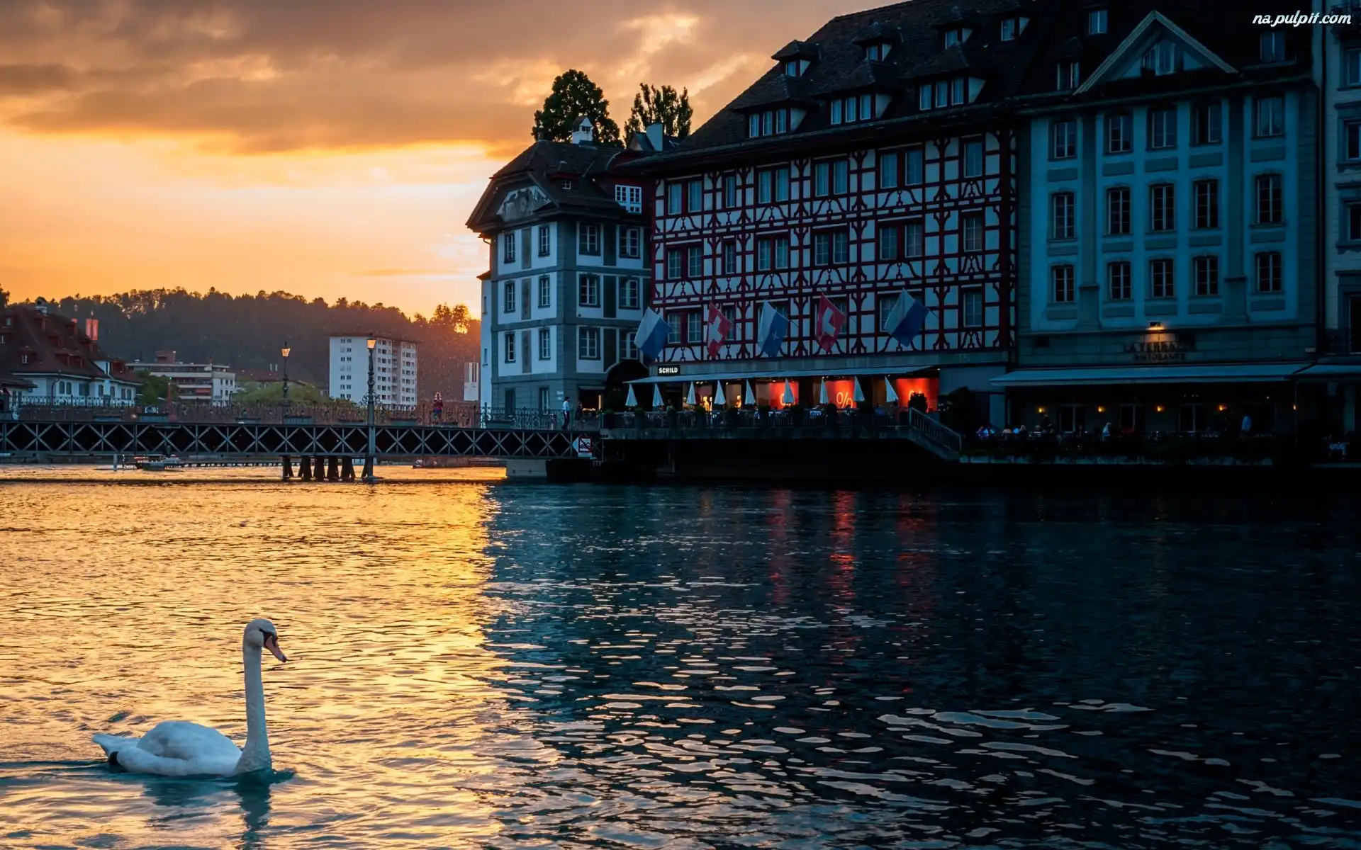 Słońca, Łabędź, Zachód, Restauracja, Most, Rzeka, Miasto Na Pulpit