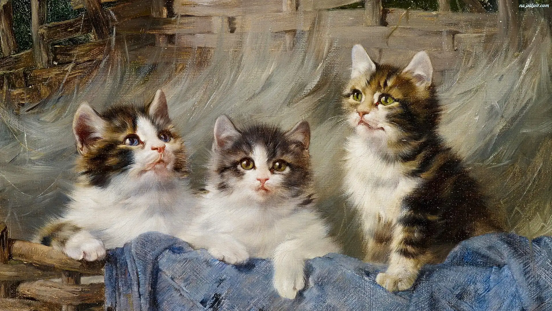 Julius Adam, Koty, Obraz, Kosz, Kocięta, Trzy, Malarstwo