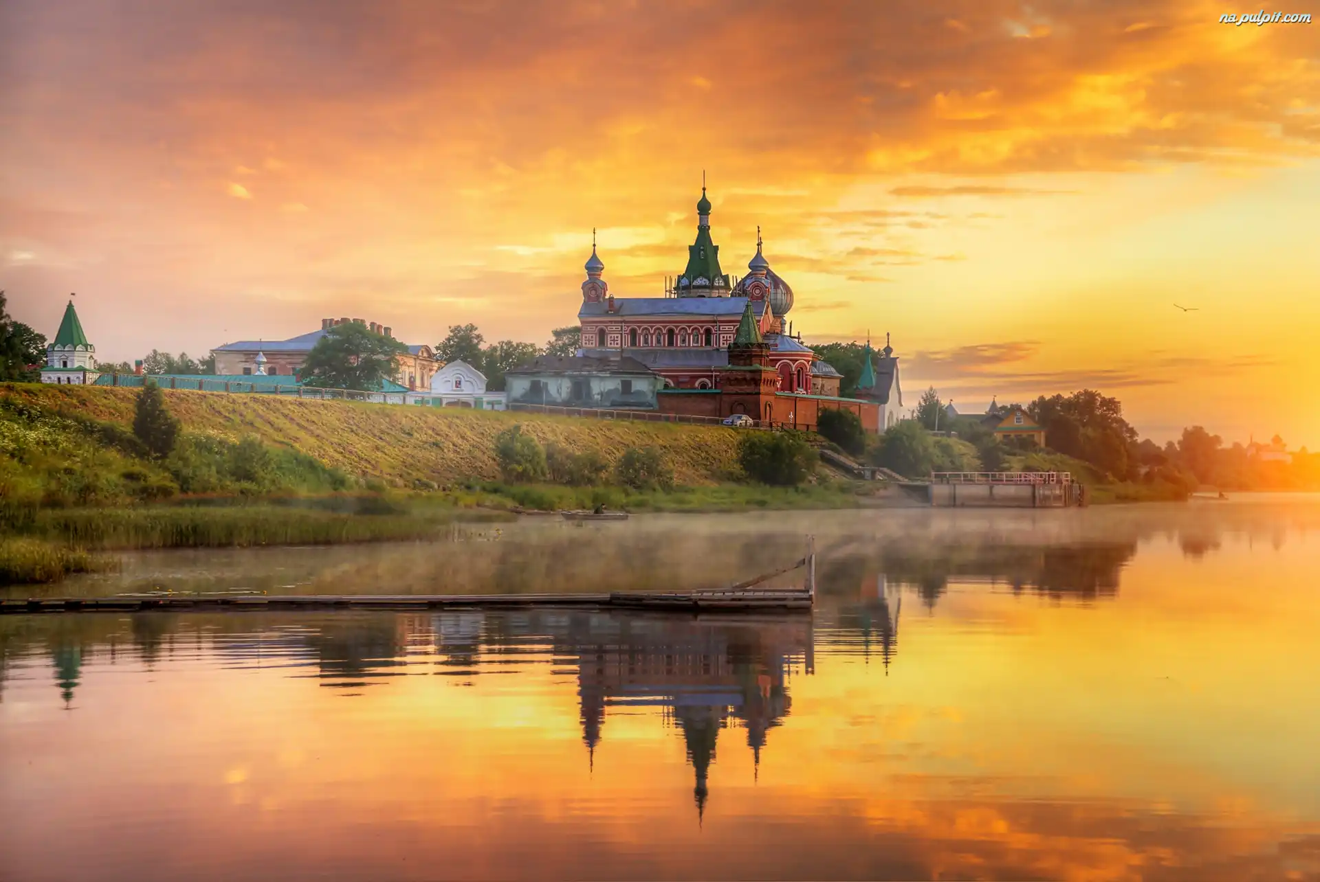 Cerkiew, Mgła, Zachód słońca, Rzeka Wołchow, Rosja, Wieś Stara Ładoga Na Pulpit