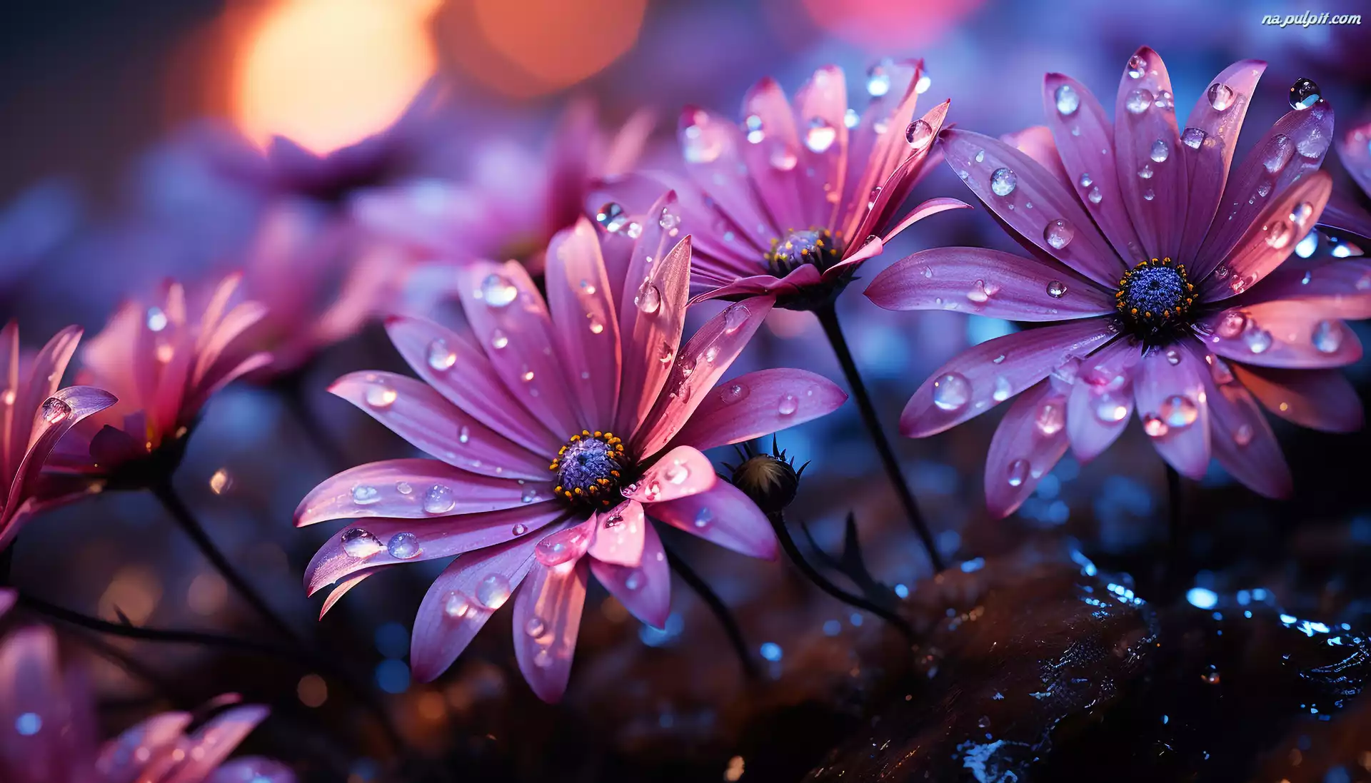 Światło, Fioletowe, Stokrotki afrykańskie, Krople, Kwiaty, Grafika