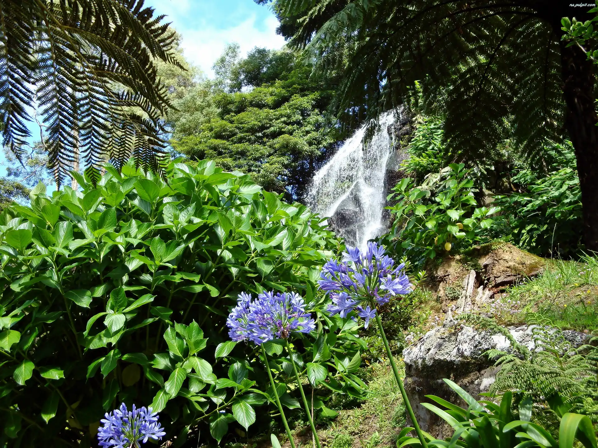 Agapanty, Skały, Wodospad, Las, Kwitnące Na Pulpit