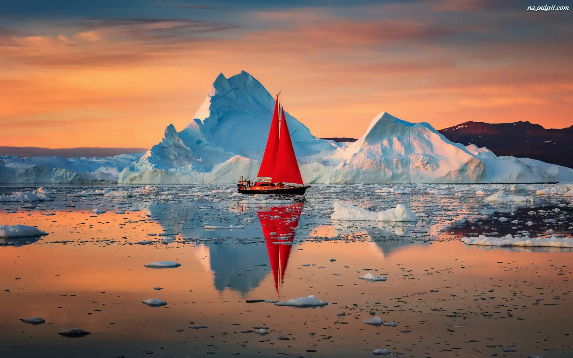 Żagle, Morze, Czerwone, Wschód słońca, Odbicie, Góry lodowe, Żaglówka Na Pulpit