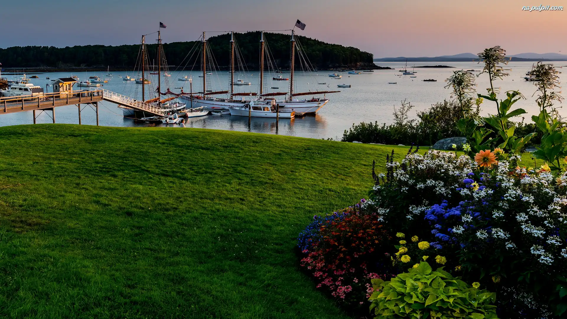 Bar Harbor, Żaglówki, Jezioro, Stan Maine, Stany Zjednoczone, Rabatka, Przystań, Kwiaty