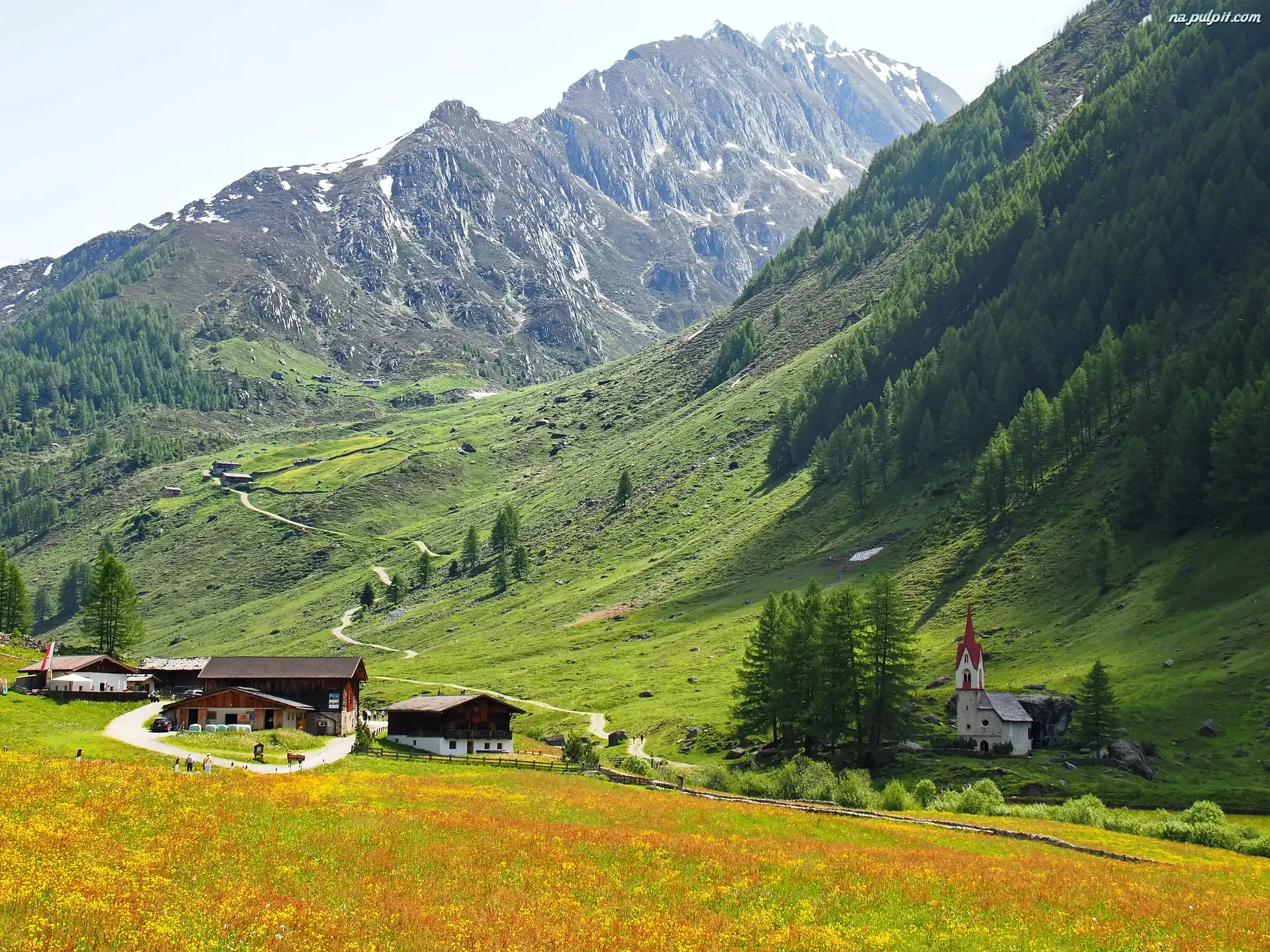 Kościół, Góry, Dolina Ahrntal, Domy, Alpy, Włochy Na Pulpit