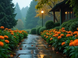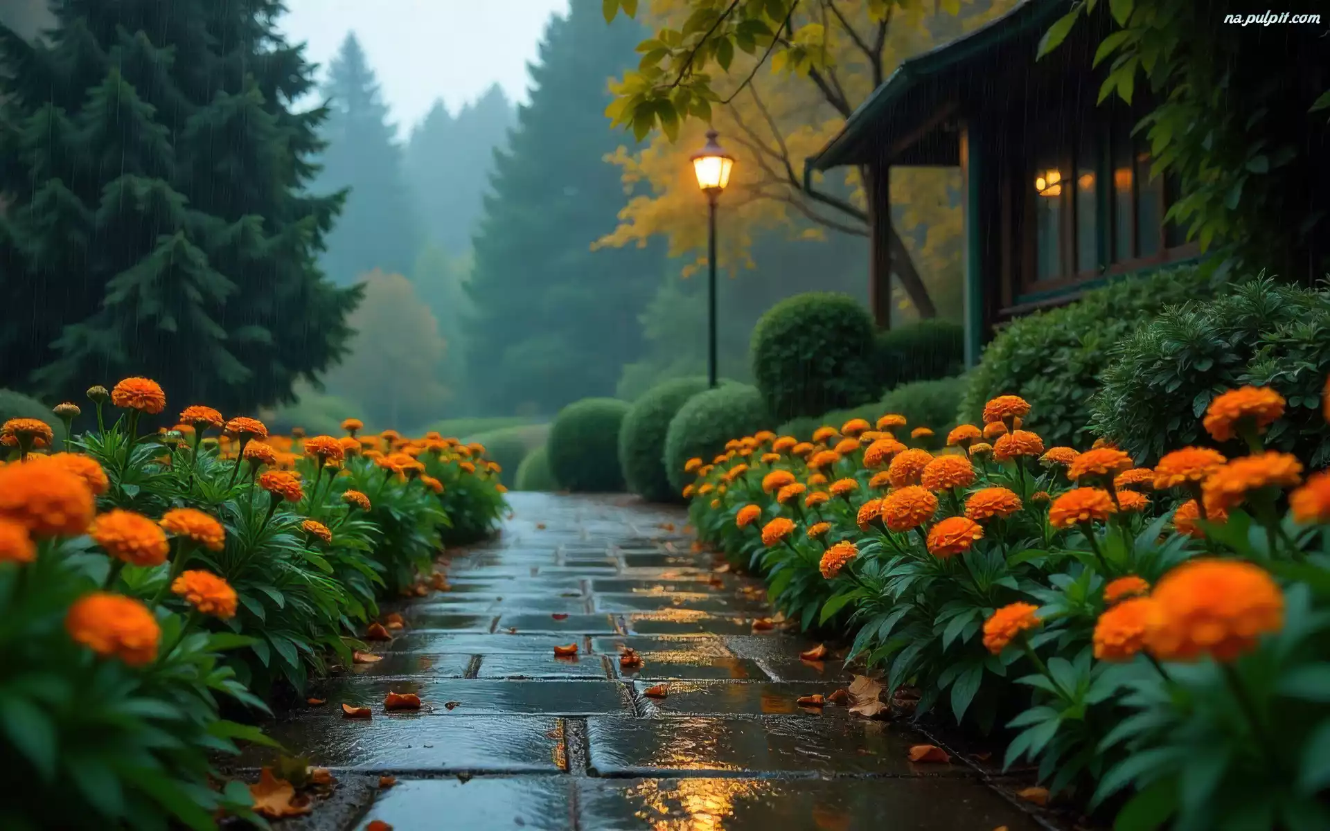 Kwiaty, Park, Deszcz, Alejka, Latarnia, Drzewa, Pomarańczowe, Aksamitki, Grafika AI, Krzewy, Dom Na Pulpit |