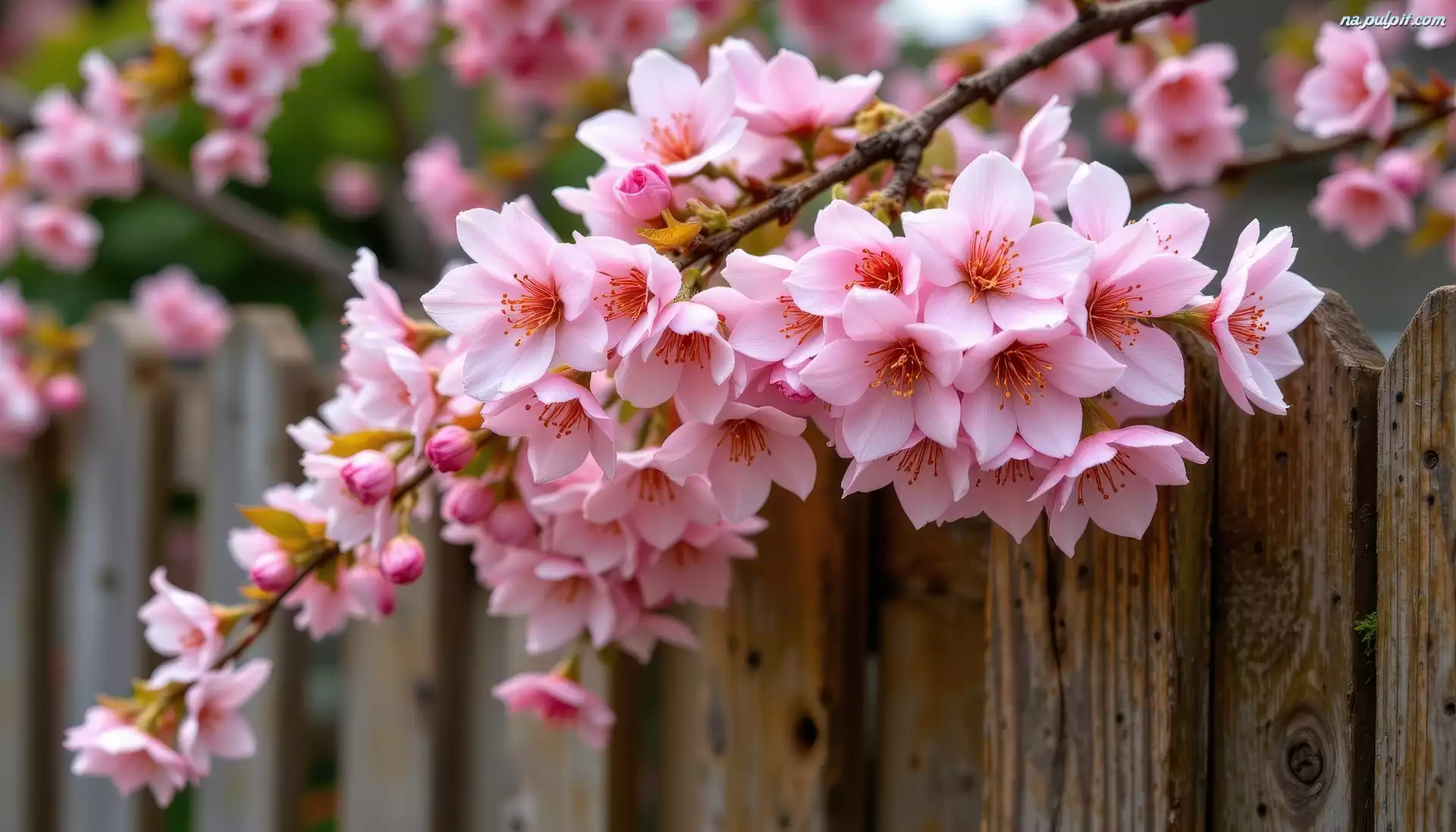 Płot, Gałązka, Kwiaty, Drzewo owocowe, Różowe, Grafika AI Na Pulpit