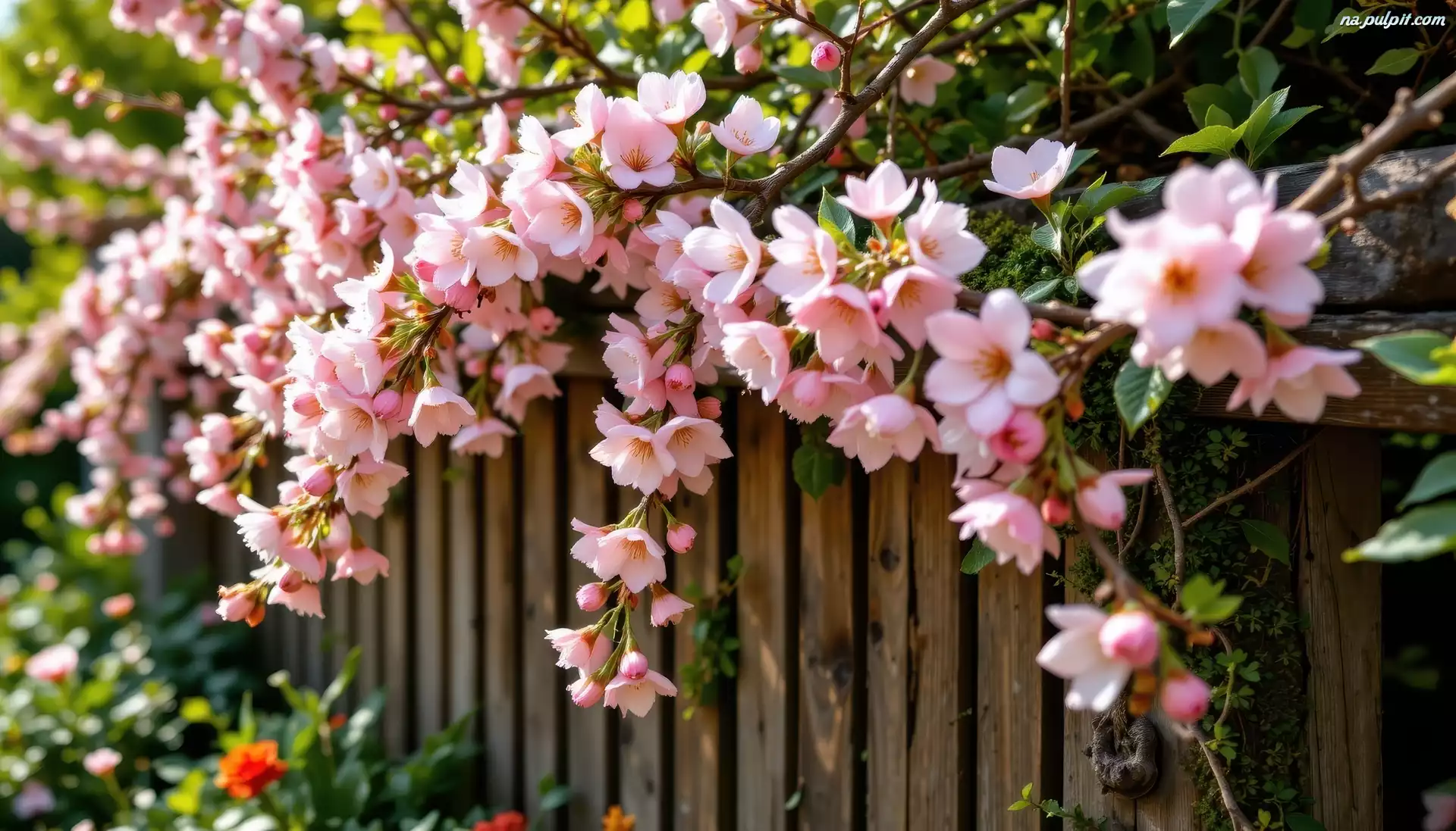Płot, Gałązki, Kwiaty, Drzewo owocowe, Różowe, Grafika AI Na Pulpit