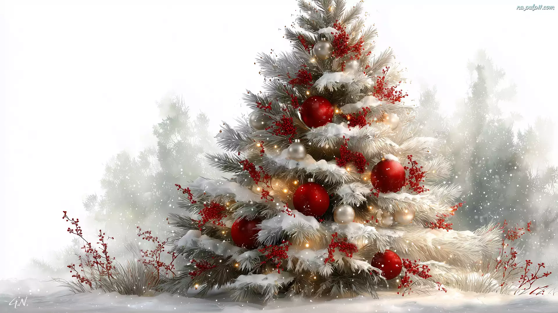 Śnieg, Boże Narodzenie, Czerwone, Bombki, Choinka, Grafika AI Na Pulpit
