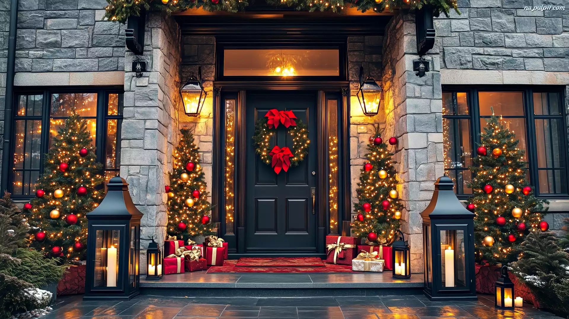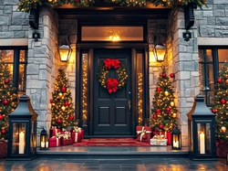 Lampy, Boże Narodzenie, Drzwi, Choinki, Dom, Grafika AI Na Pulpit