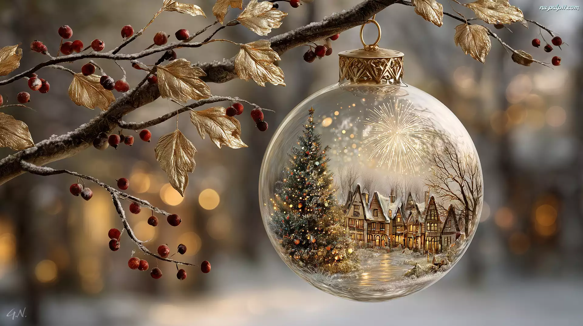 Gałązka, Boże Narodzenie, Złote, Liście, Bombka, Grafika AI Na Pulpit