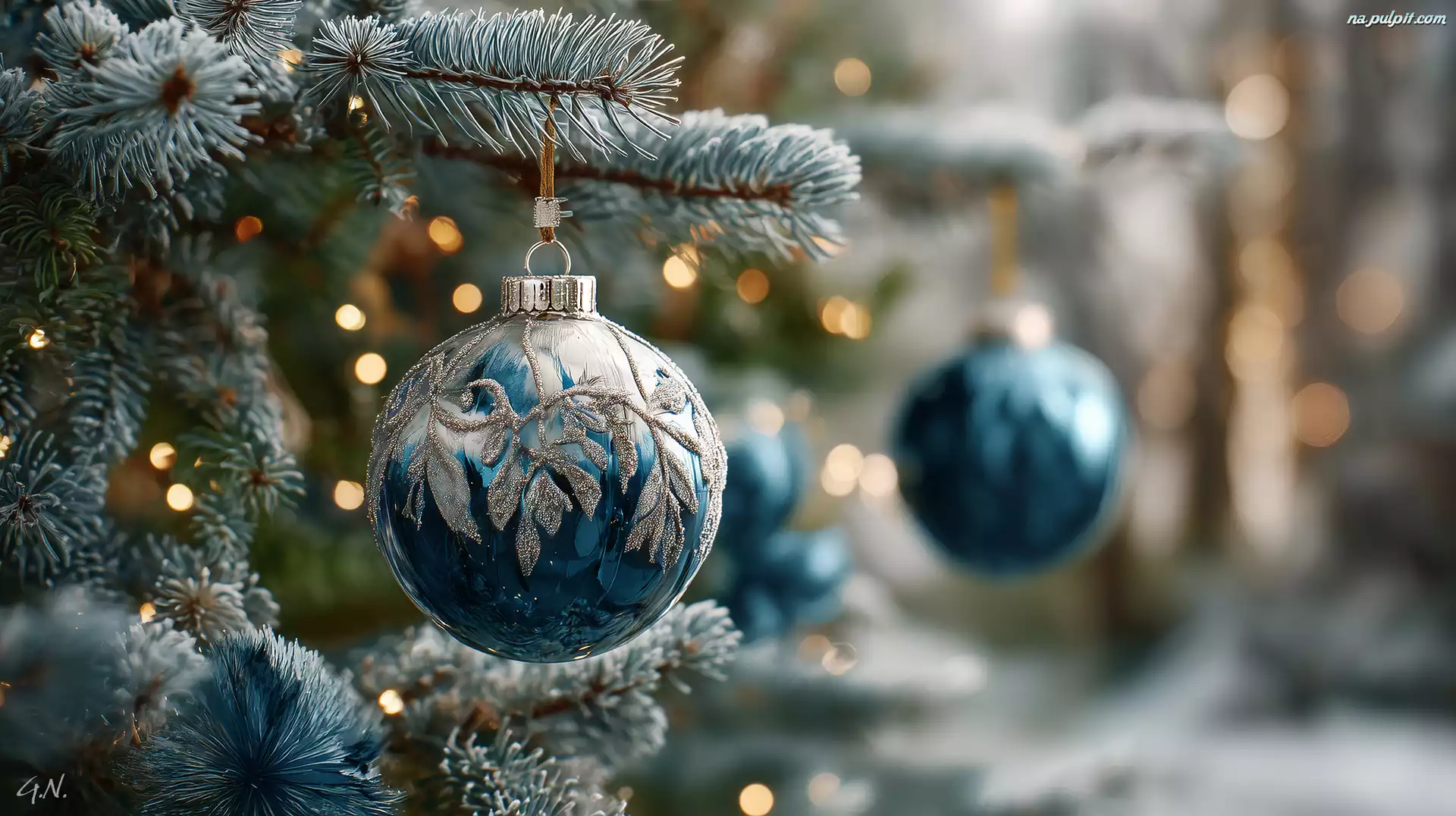 Boże Narodzenie, Niebieska, Gałązki, Świerka, Bombka, Grafika AI Na Pulpit