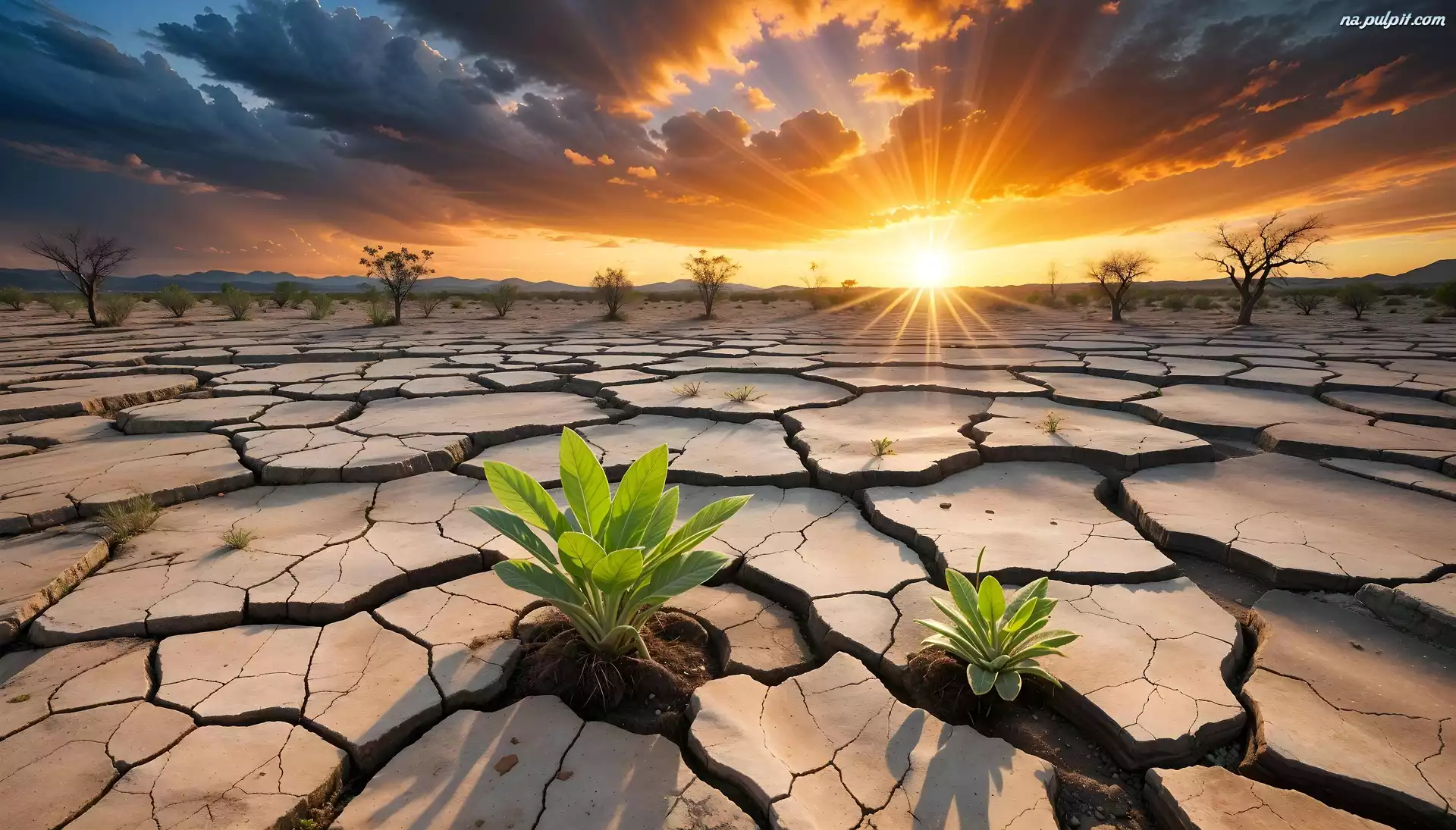 Promienie słońca, Pustynia, Ziemia, Rośliny, Spękana, Grafika AI Na Pulpit