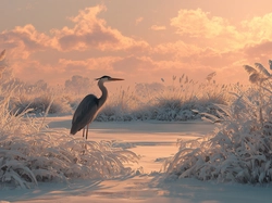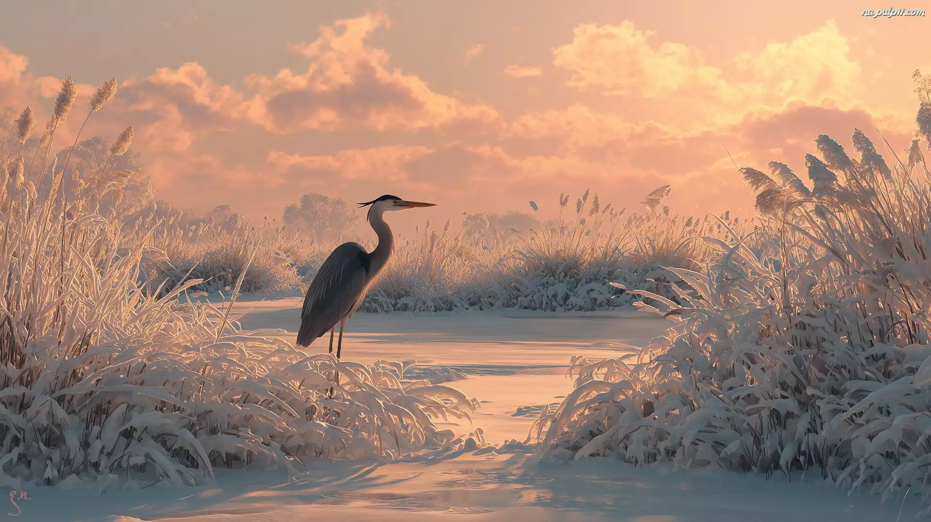 Szuwary, Czapla siwa, Ośnieżone, Trawy, Zima, Grafika AI Na Pulpit