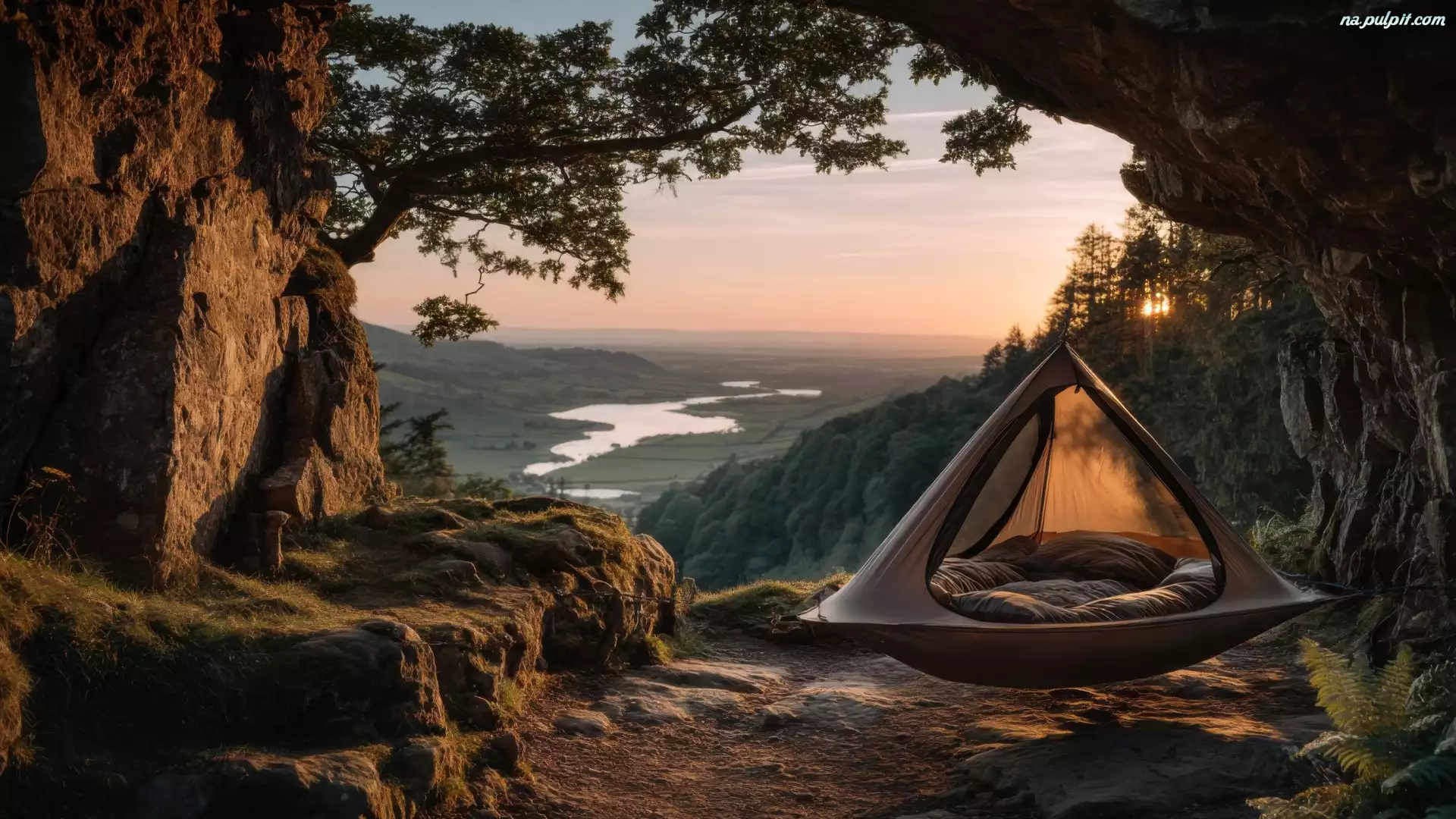 Rzeka, Wschód słońca, Drzewa, Hamak, Skały, Grafika AI Na Pulpit