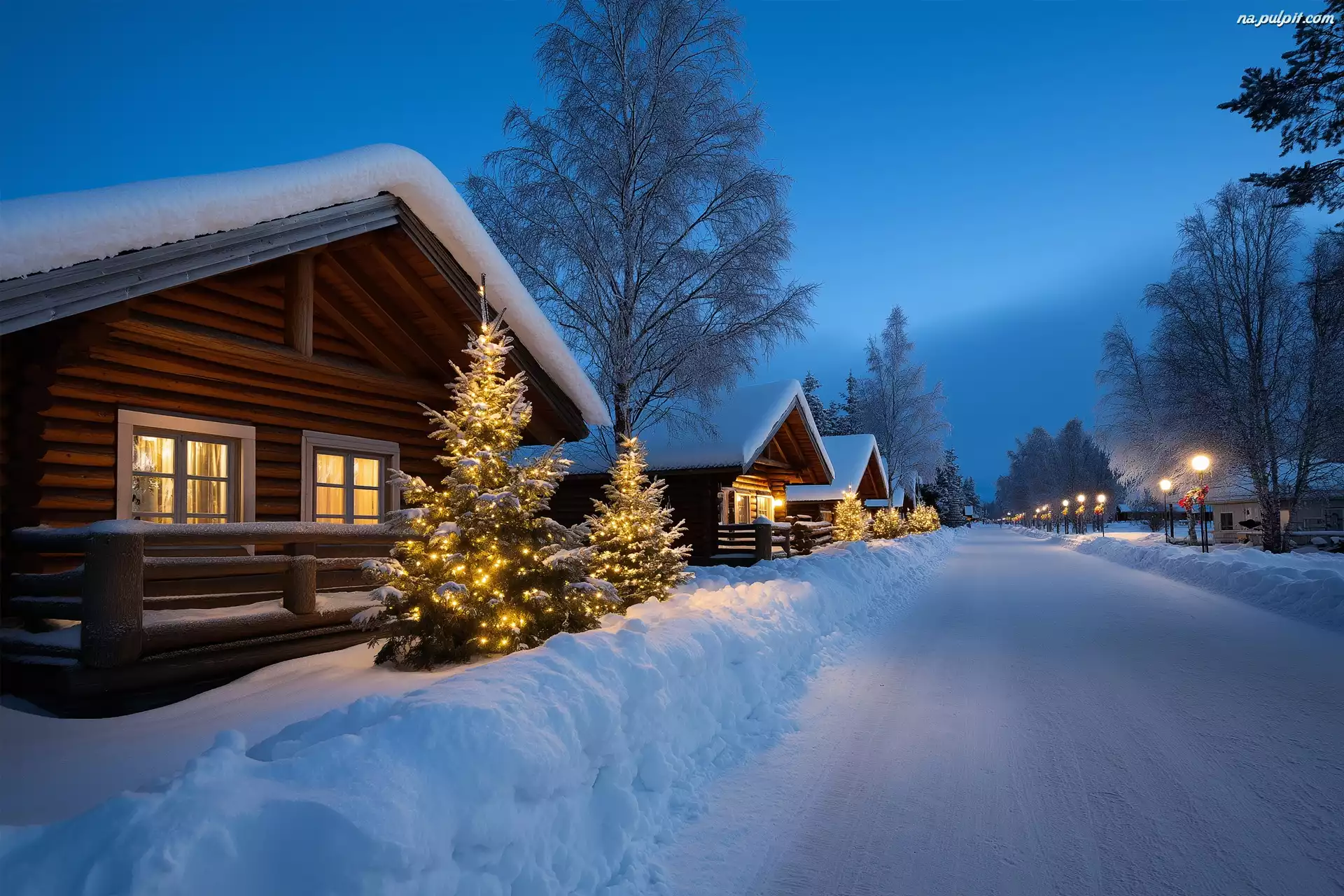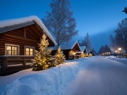 Boże Narodzenie, Zima, Domy, Choinki, Droga, Grafika AI Na Pulpit