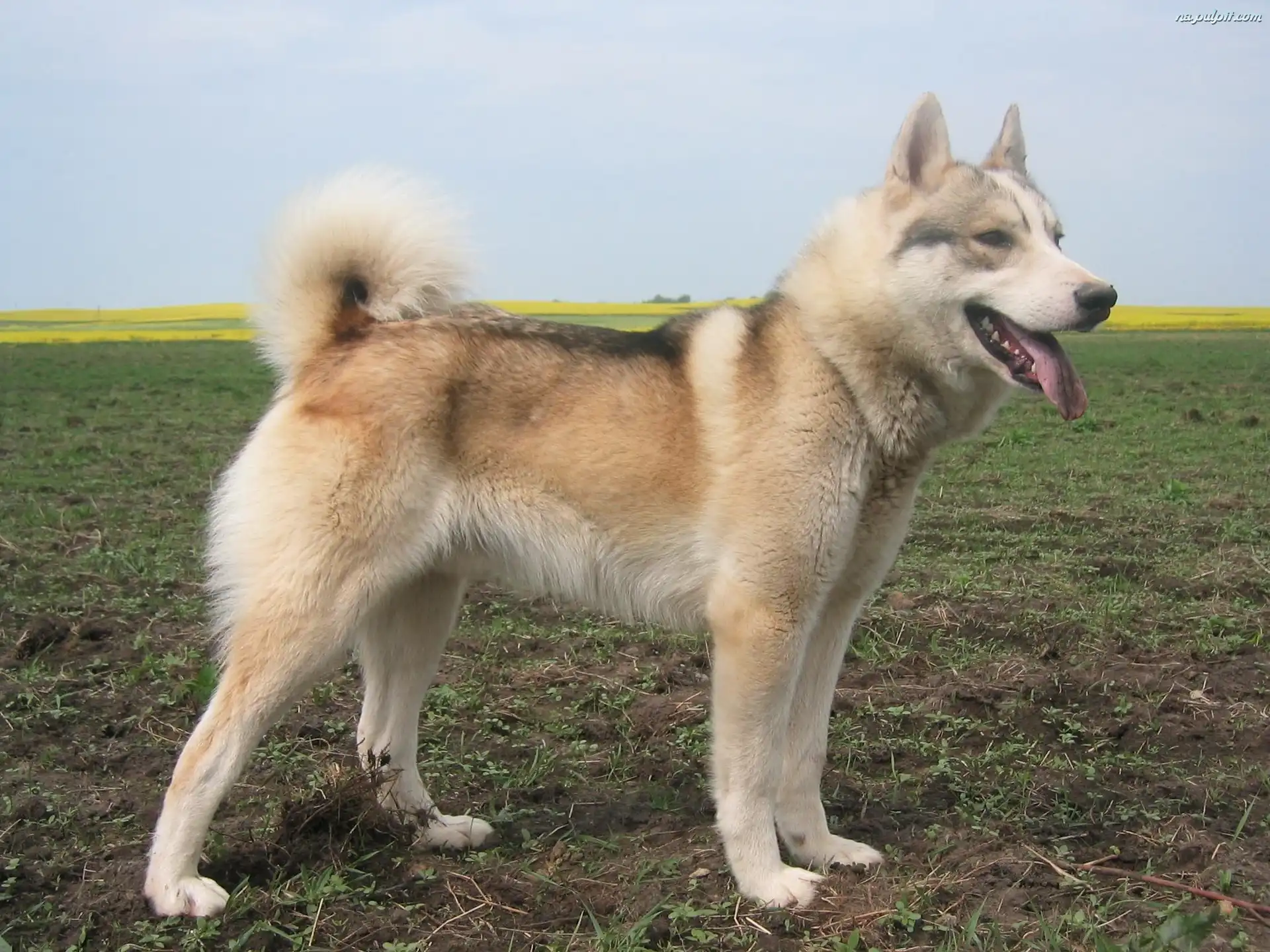 kamyki, Łajka zachodniosyberyjska, płot trawa, Łajka zachodniosyberyjska, biała, zielona niebo, Łajka zachodniosyberyjska, błękitne Łajka zachodniosyberyjska uszy, Łajka zachodniosyberyjska, postawione śnieg, cztery, Łajki zachodniosyberyjskie