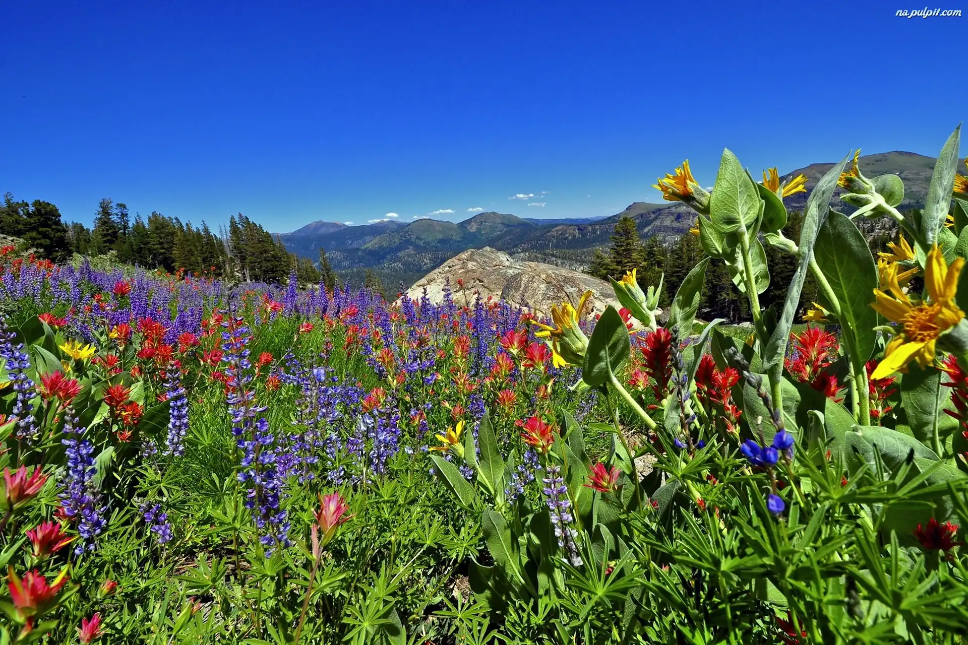 Łąka, Kwiaty, Kalifornia, Sierra Nevada, Góry