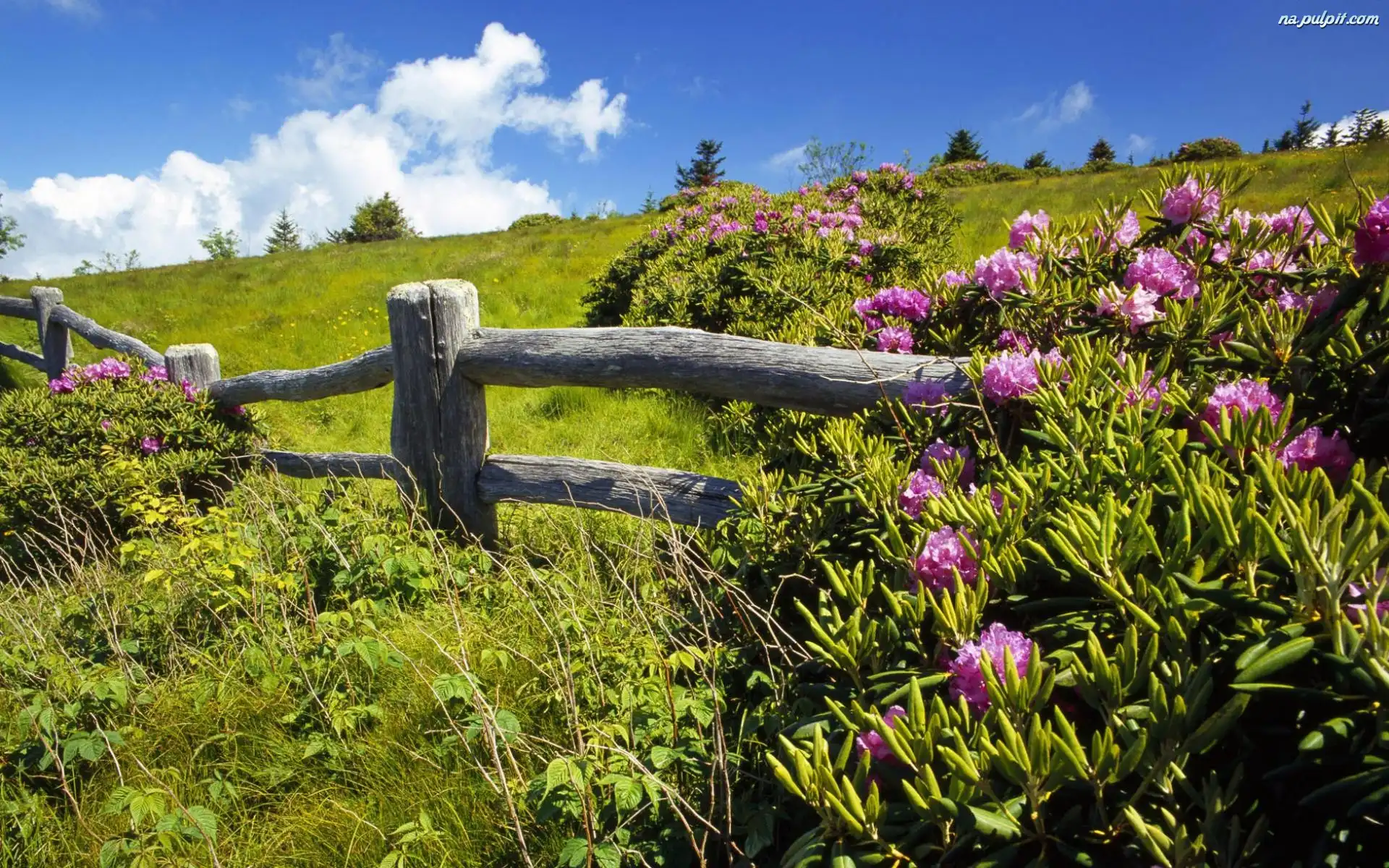 Łąka, Różowych, Rododendronów, Płotek, Wiosna, Krzewy