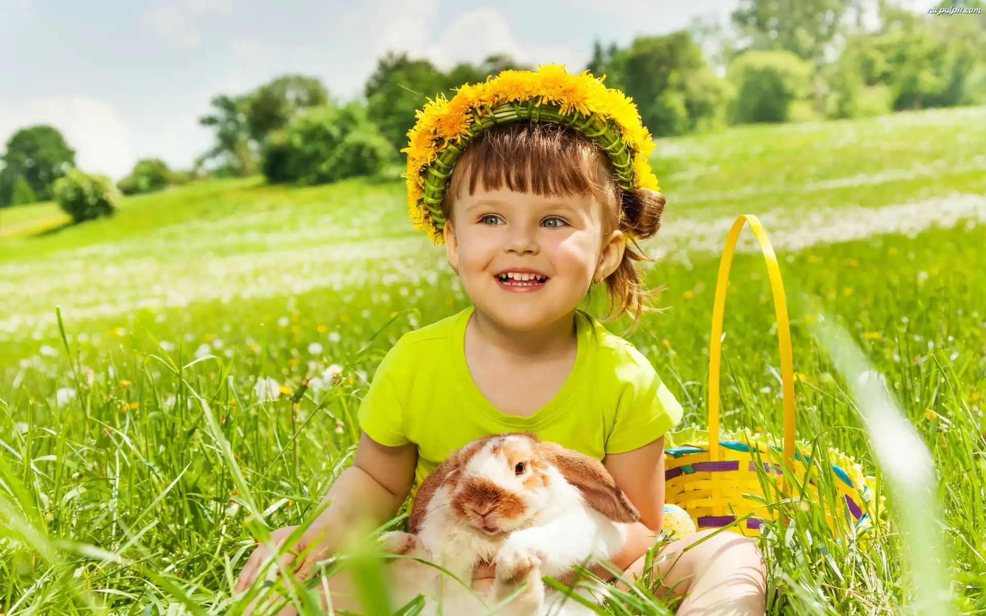 Łąka, Królik, Koszyk, Wianuszek, Dziewczynka, Mlecze Na Pulpit