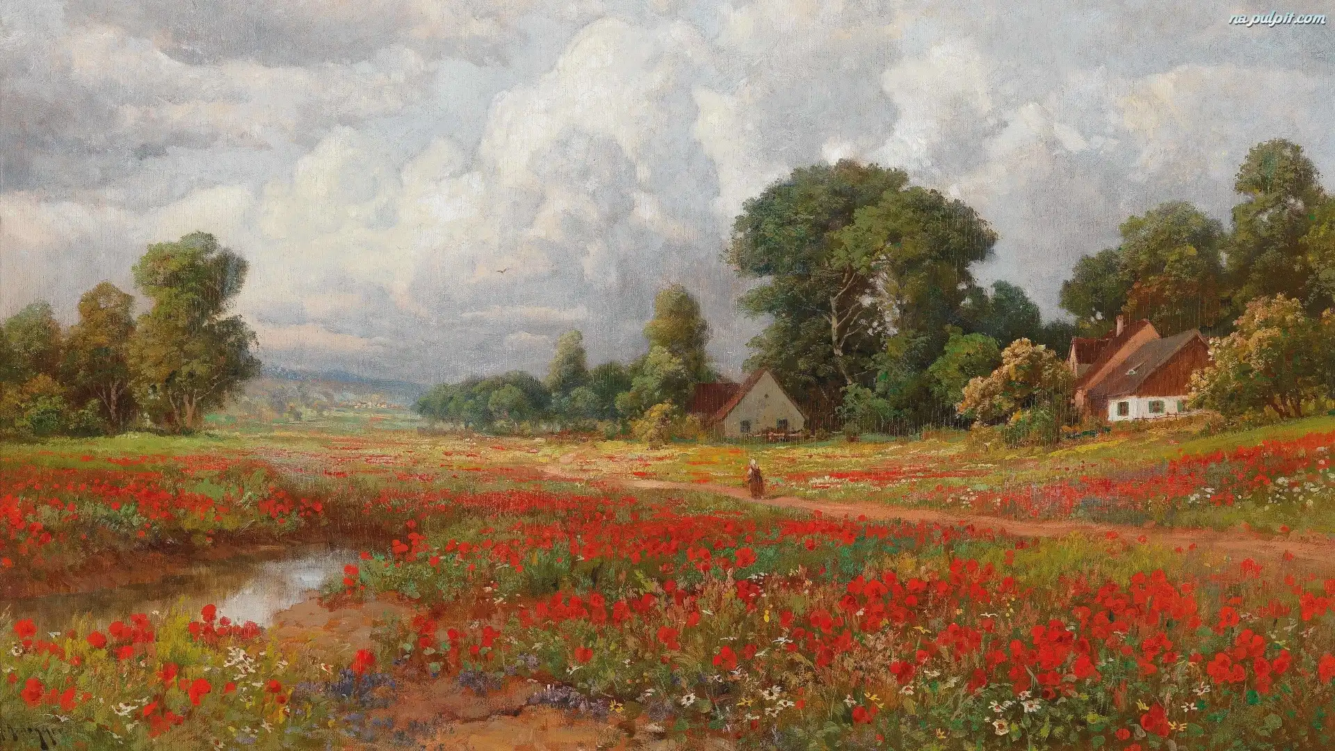 Maki, Alois Arnegger, Wieś, Drzewa, Staw, Domy, Malarstwo, Łąka Na Pulpit
