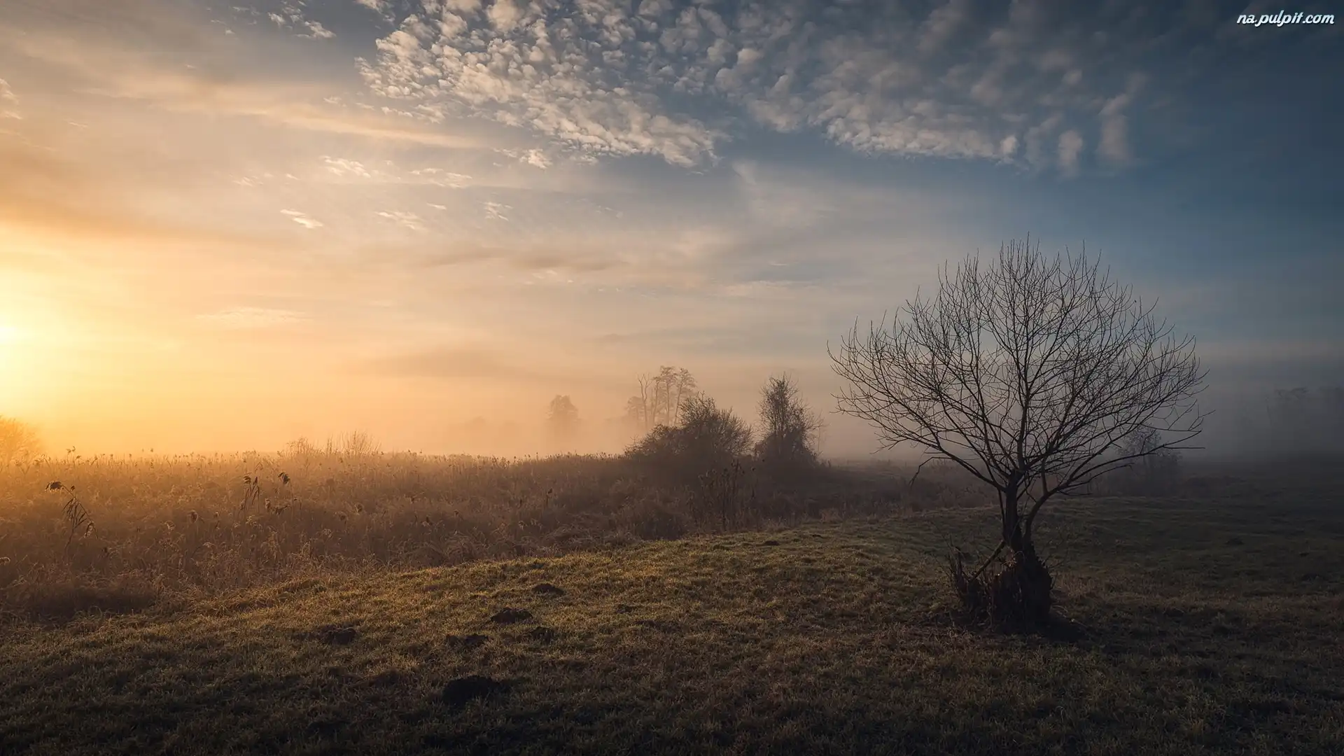 Łąka, Mgła, Wschód słońca, Niebo, Drzewo, Chmury Na Pulpit