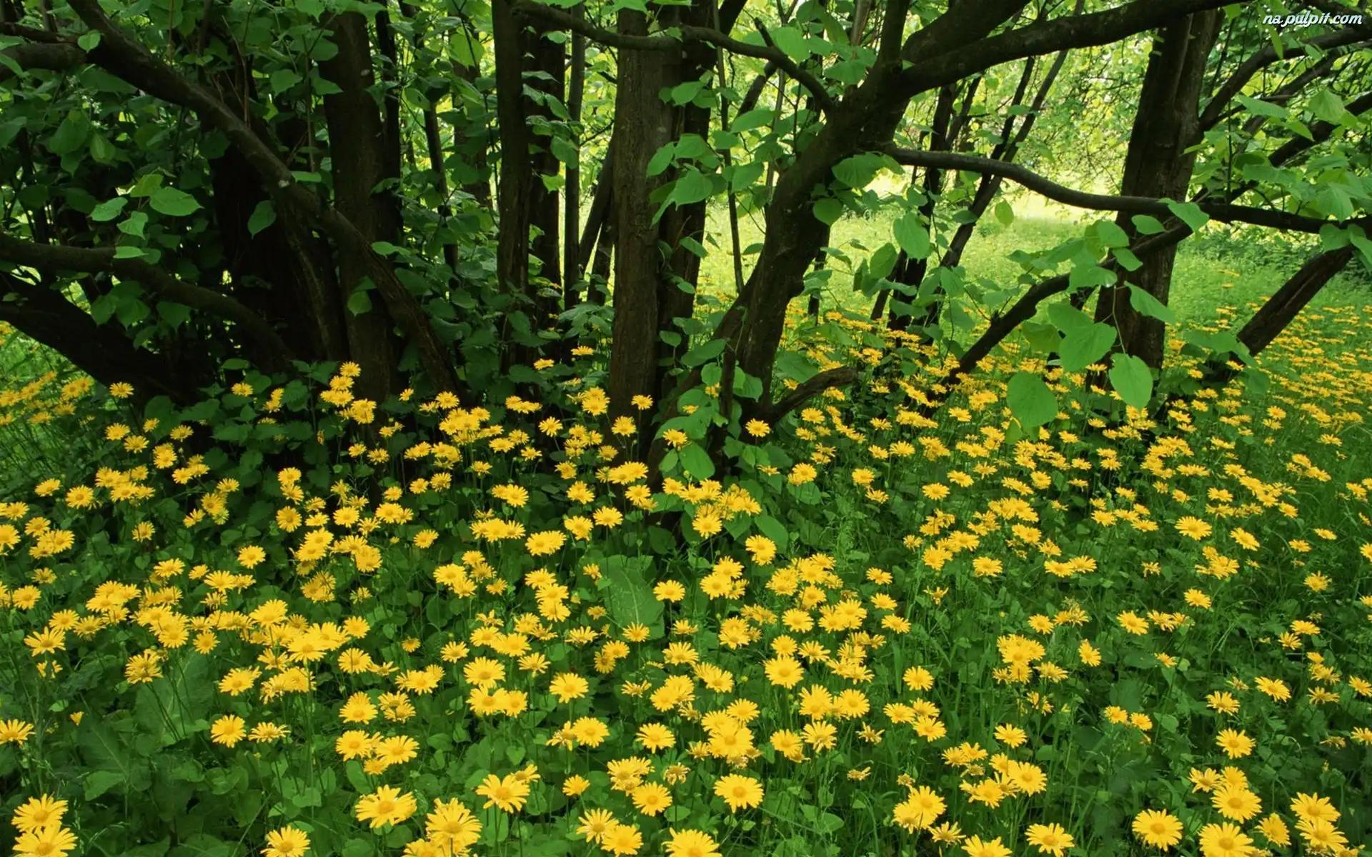 Drzewa, Łąka, Kwiaty Na Pulpit