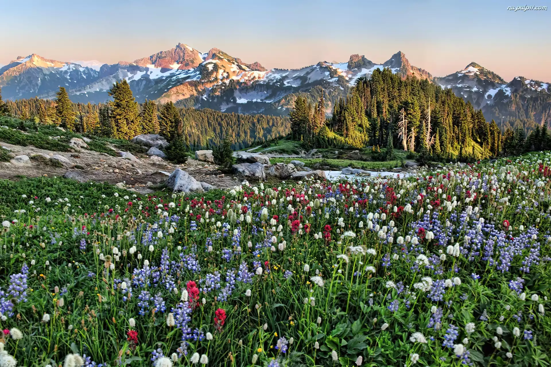 Drzewo, Jezioro, Trawy Szczyty, Górskie Domki, Azja, Góry Kwiaty Łodygi, Zielone, Suche Zamieć, Góry, śnieg Krzak, Uprawy, Pole łąka Słonecznik ozdobny śnieg, łąka, Góry, woda chmury, łąka, zielona, Góry, drzewa Niebieska, Frezja Drzewo, Tęcza, łąka Krzew, łąka, Góry, Niebo