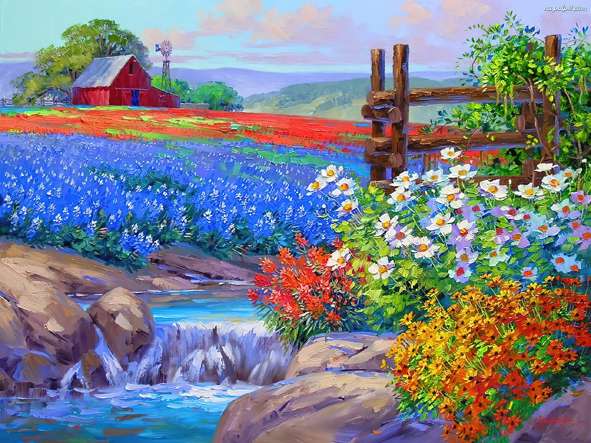 Kwiaty, Łąka, Rzeczka Na Pulpit