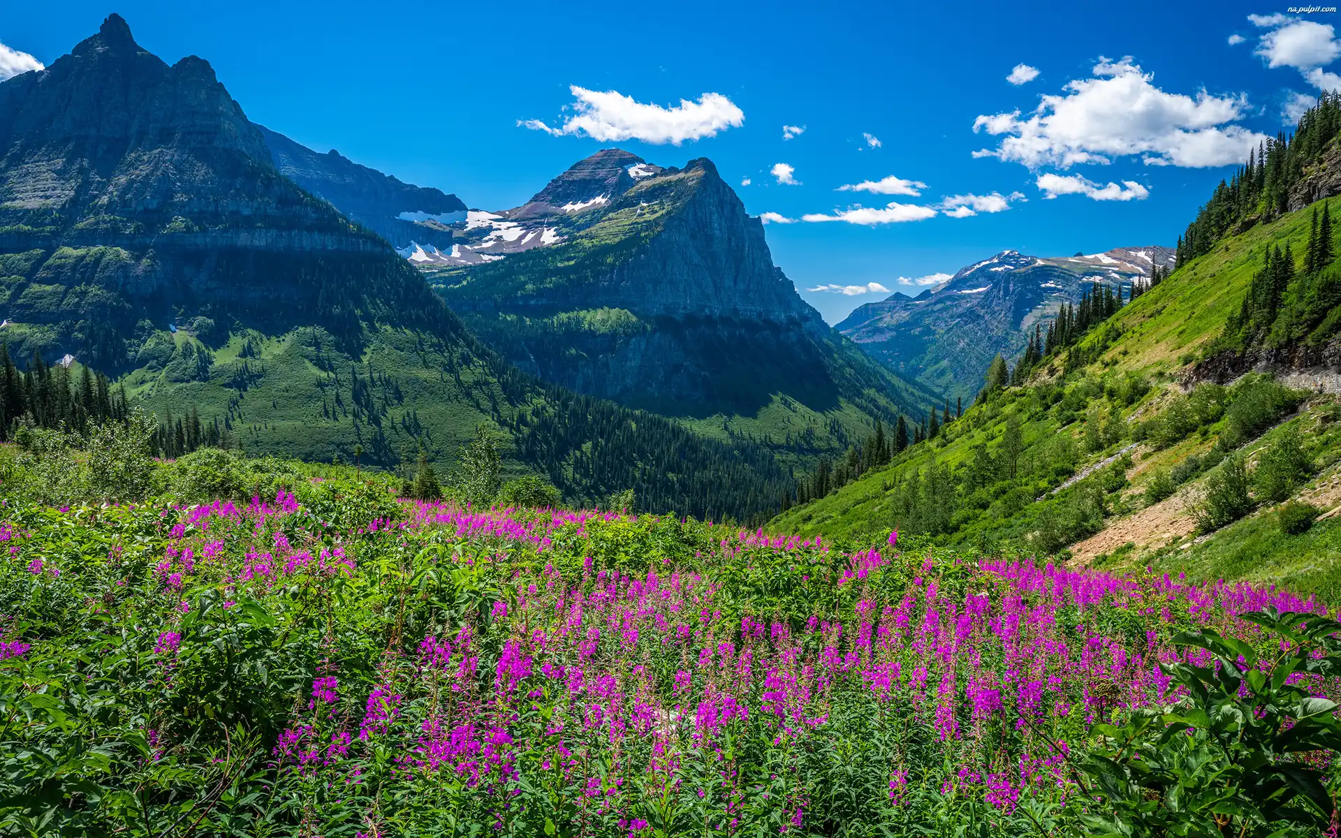 Kwiaty, Montana, Łąka, Góry Skaliste, Park Narodowy Glacier, Stany Zjednoczone, Drzewa Na Pulpit