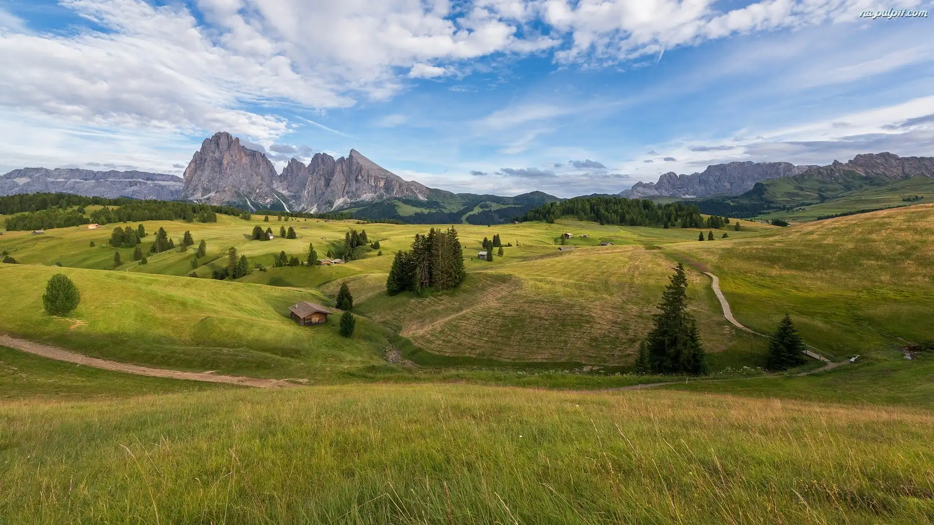 Dolomity, Łąki, Domy, Góry, Włochy, Dolina Val Gardena