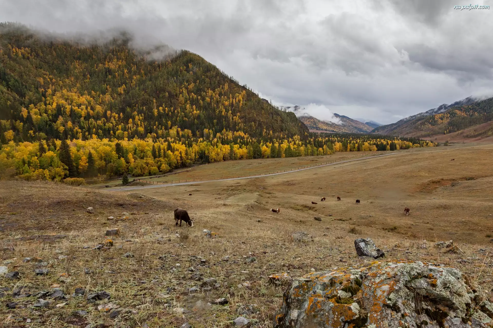 Łąki, Góry, Krowy, Las, Drzewa, Jesień, Kamienie Na Pulpit