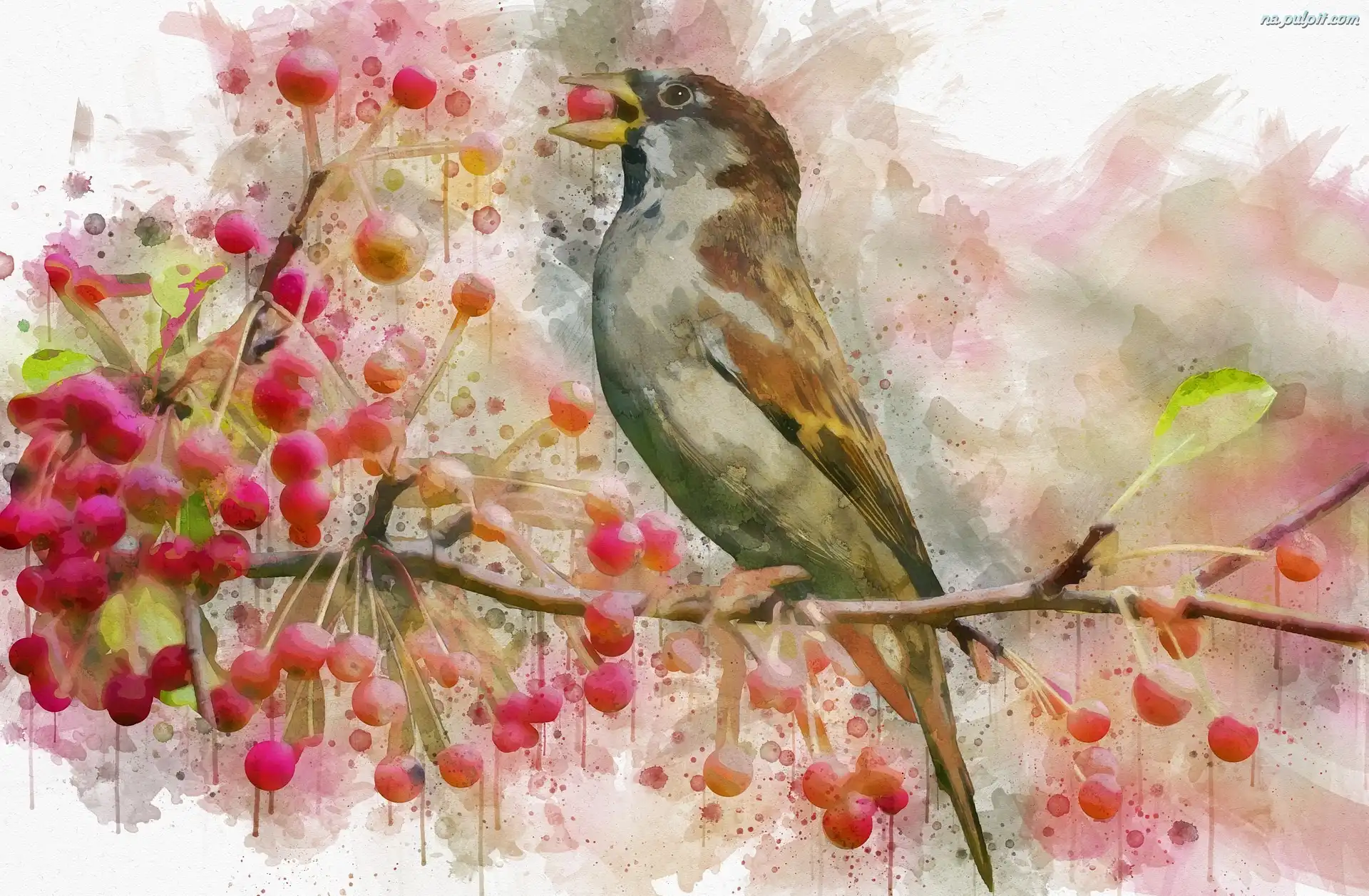 Akwarela, Czerwone, Owoce, Ptak, Obraz, Gałązka