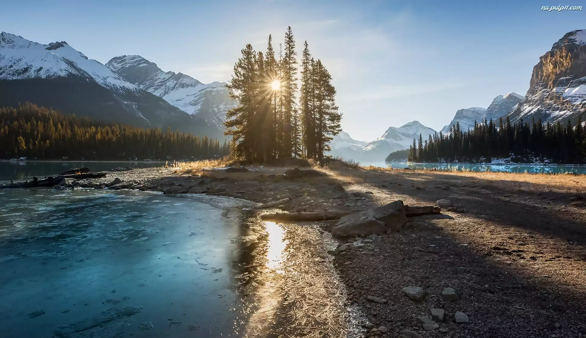 Kanada, Góry, Alberta, Drzewa, Jezioro Maligne, Park Narodowy Jasper, Promienie słońca Na Pulpit
