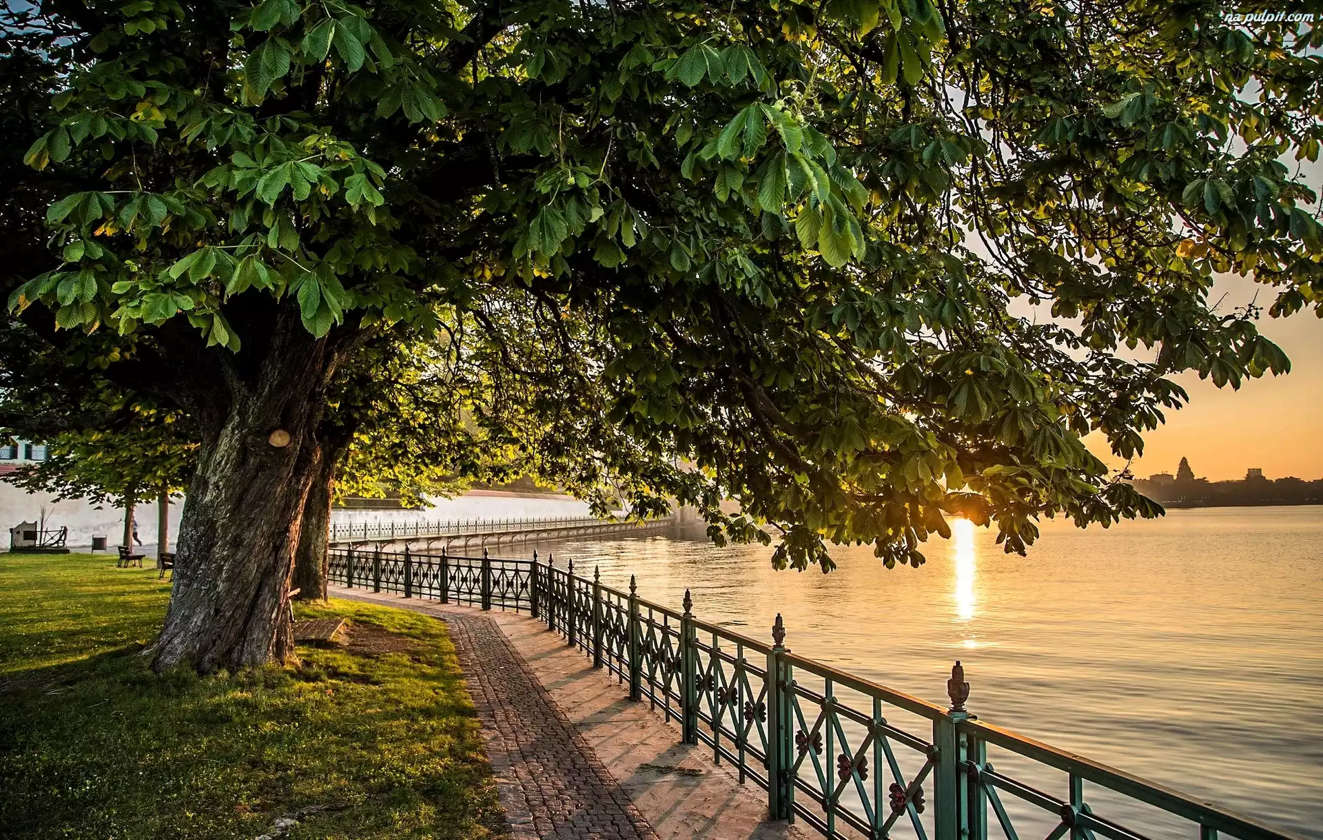 Brzeg, Alejka, Wschód słońca, Drzewa, Rzeka, Kasztanowiec Na Pulpit