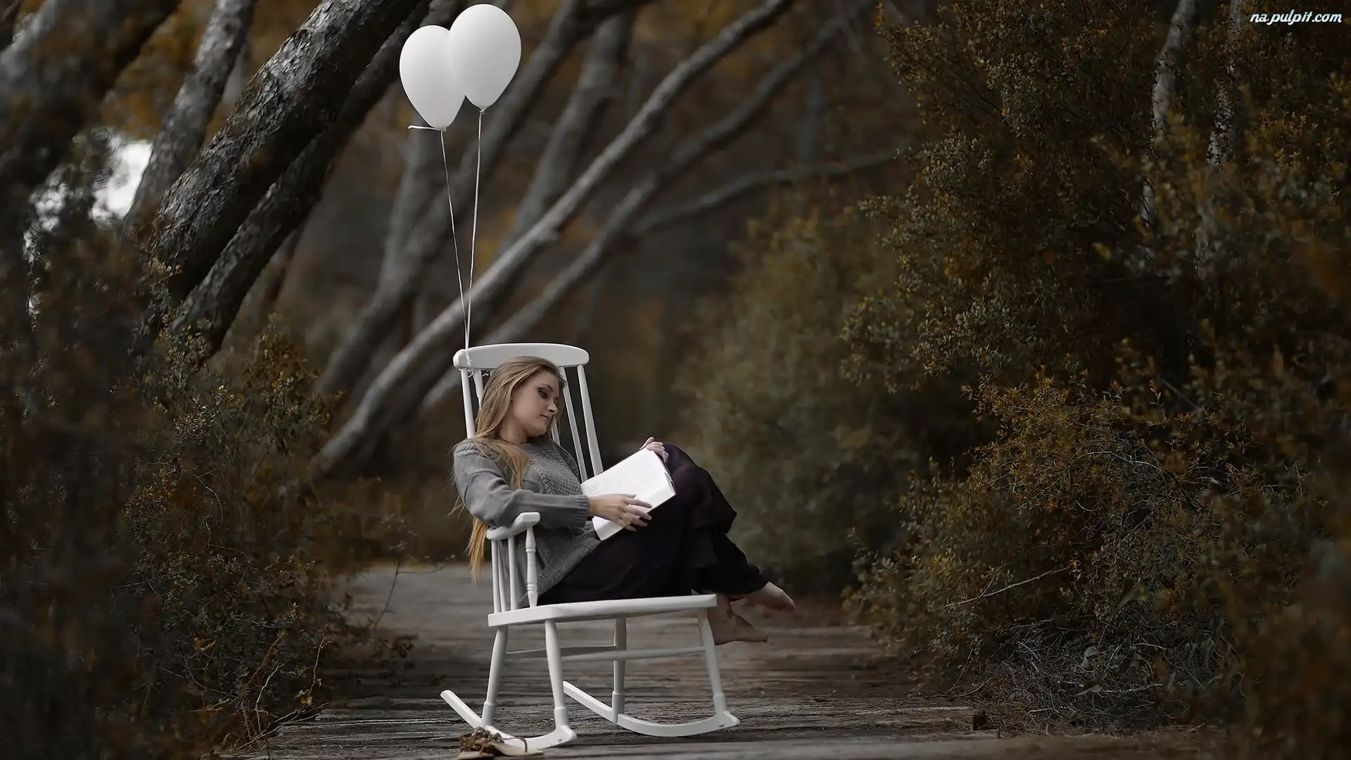 Krzewy, Alejka, Drzewa, Książka, Fotel, Kobieta, Baloniki Na Pulpit