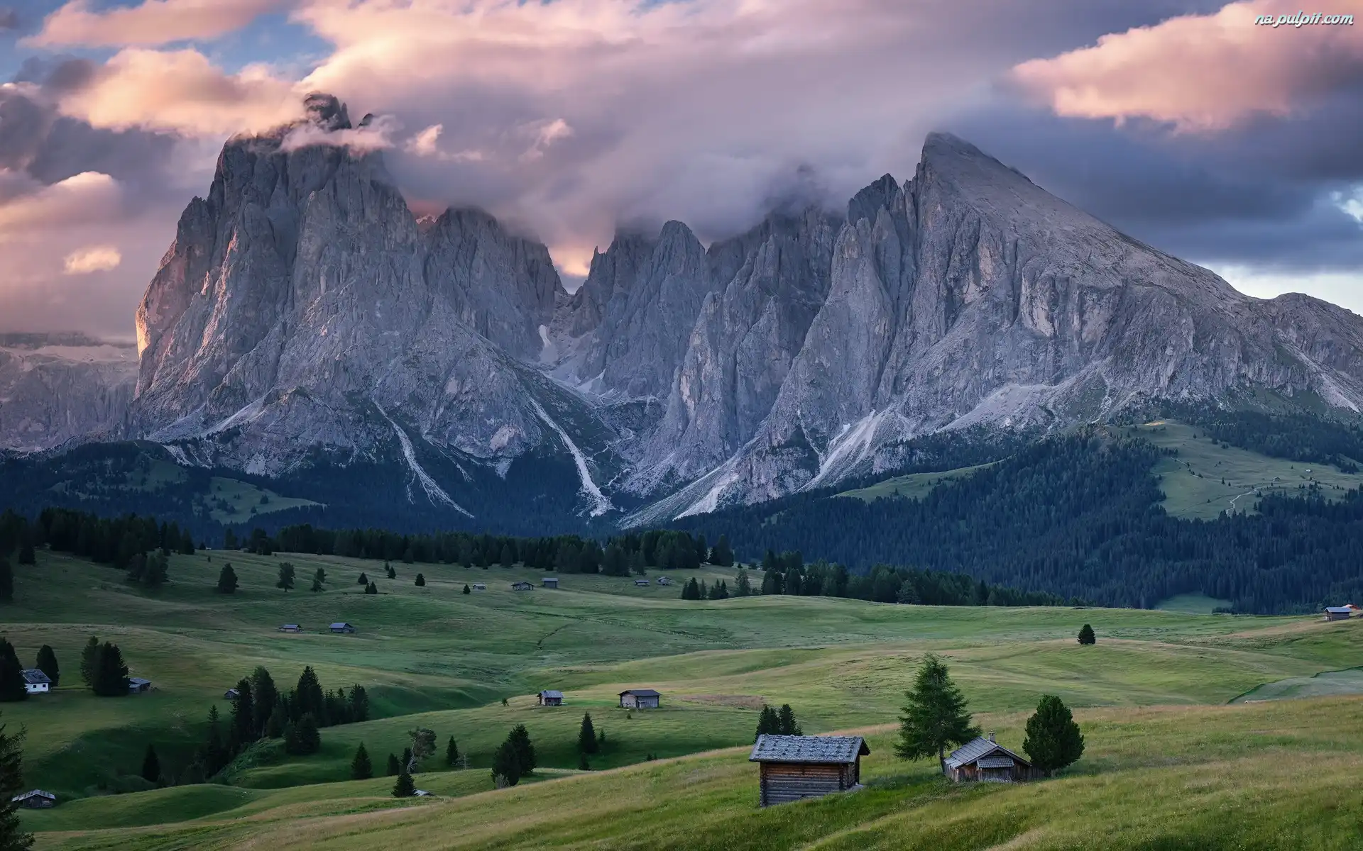Drzewa, Val Gardena, Domki, Dolina, Drewniane, Seiser Alm, Góry, Włochy, Łąki, Płaskowyż, Dolomity, Sassolungo, Chmury Na Pulpit |