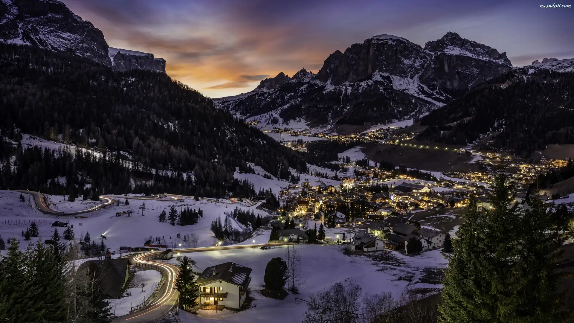 Alpy, Oświetlone, Włochy, Dolomity, Zima, Santa Cristina, Bolzano, Gmina, Dolina, Góry, Val Gardena Na Pulpit |