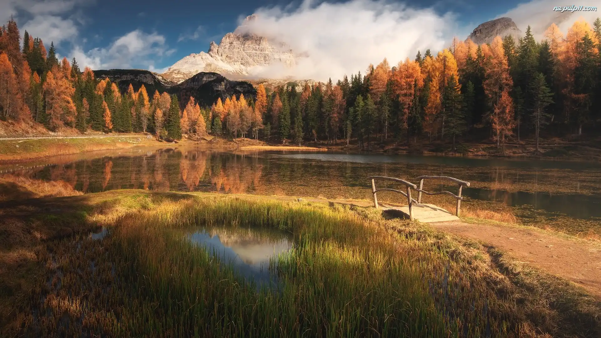 Antorno Lake, Alpy, Góry, Mostek, Jesień, Chmury, Włochy, Dolomity, Jezioro, Drzewa