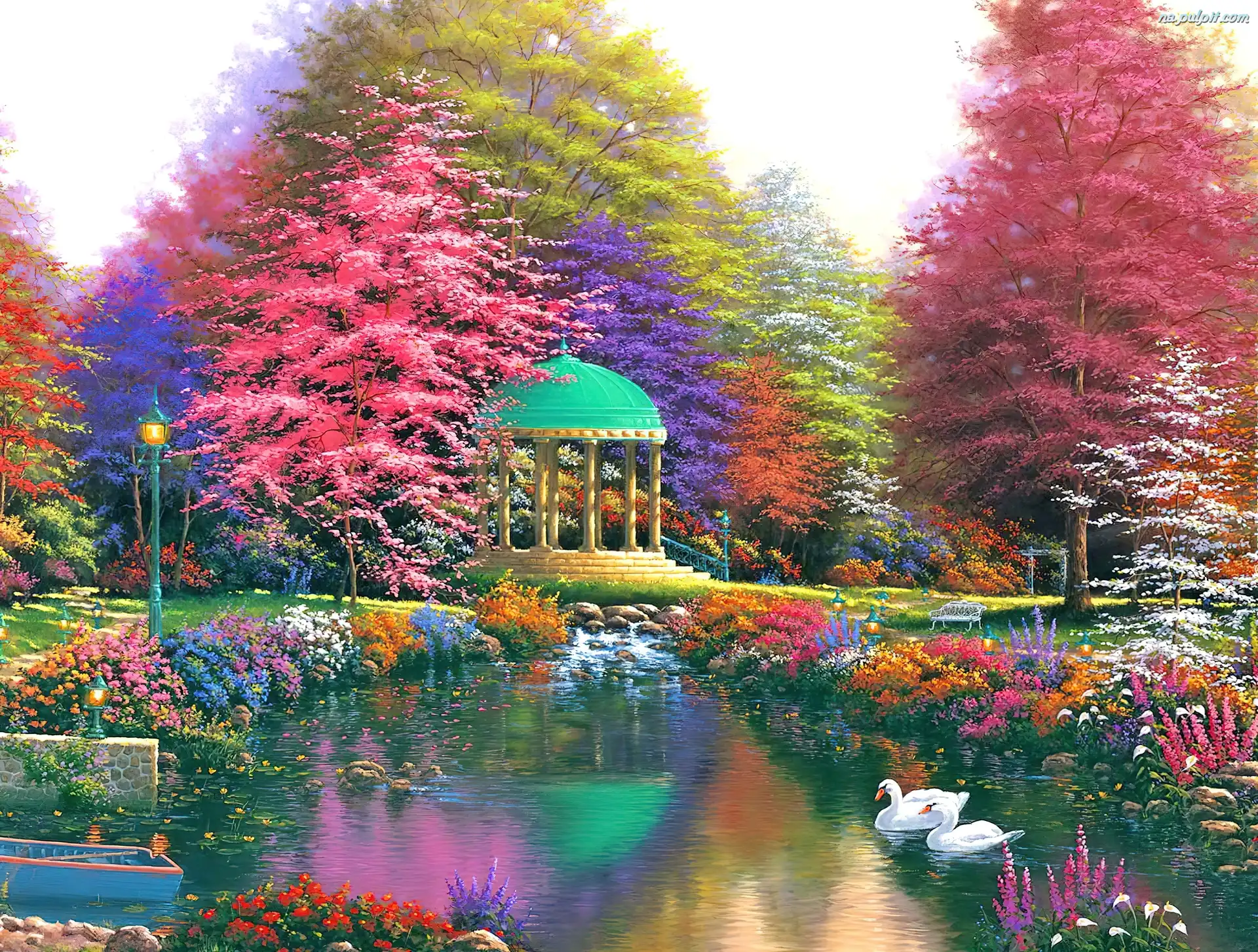 Łabędzie, Kolorowe, Staw, Altanka, Drzewa Na Pulpit