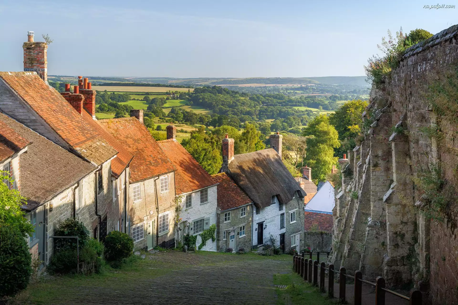 Drzewa, Zachód Słońca, Shaftesbury, Gold Hill, Ulica, Złote Wzgórze, Anglia, Mur, Domy