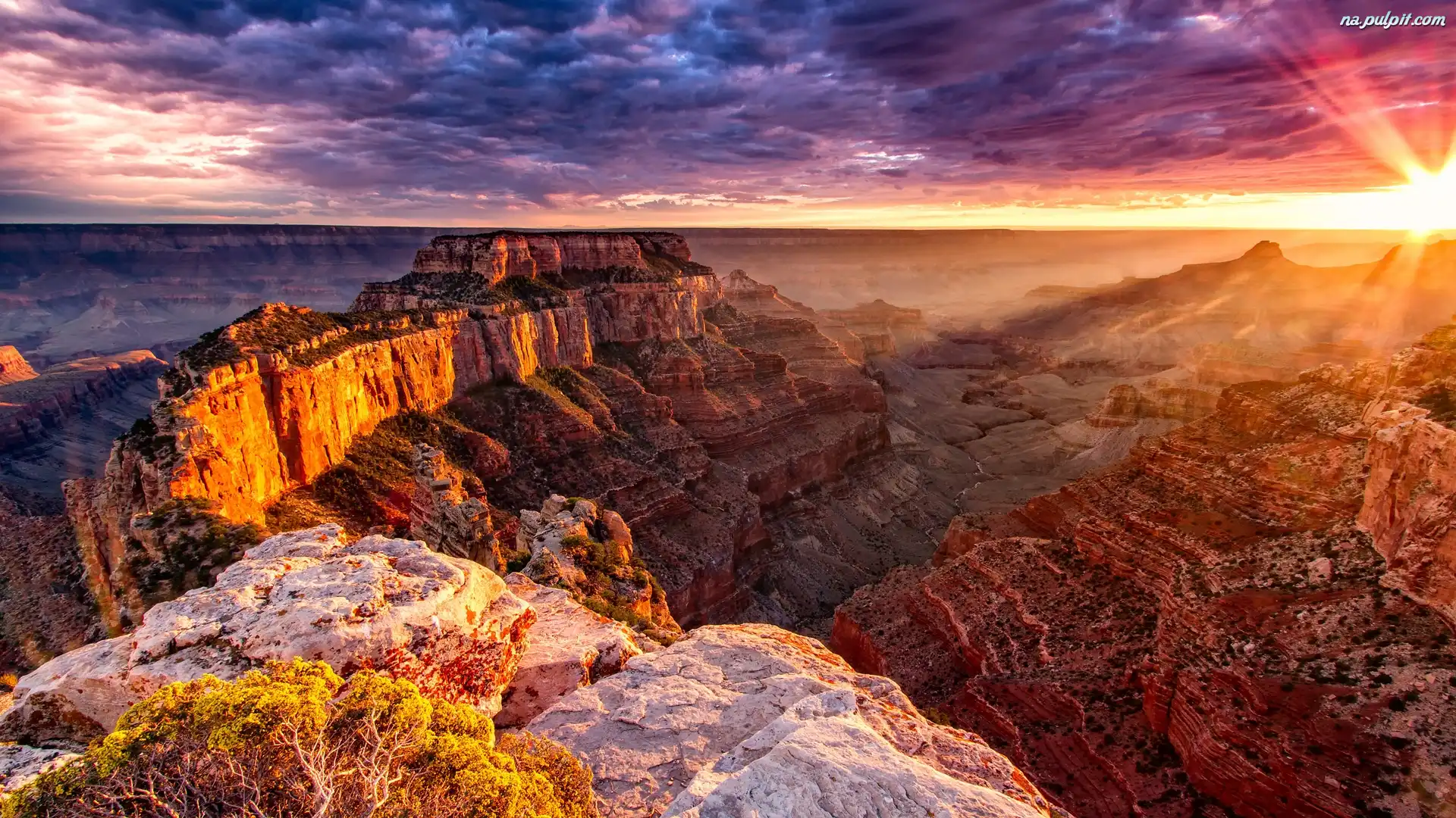 Arizona, Wschód słońca, Park Narodowy Wielkiego Kanionu, Wielki Kanion Kolorado, Stany Zjednoczone, Chmury Na Pulpit |