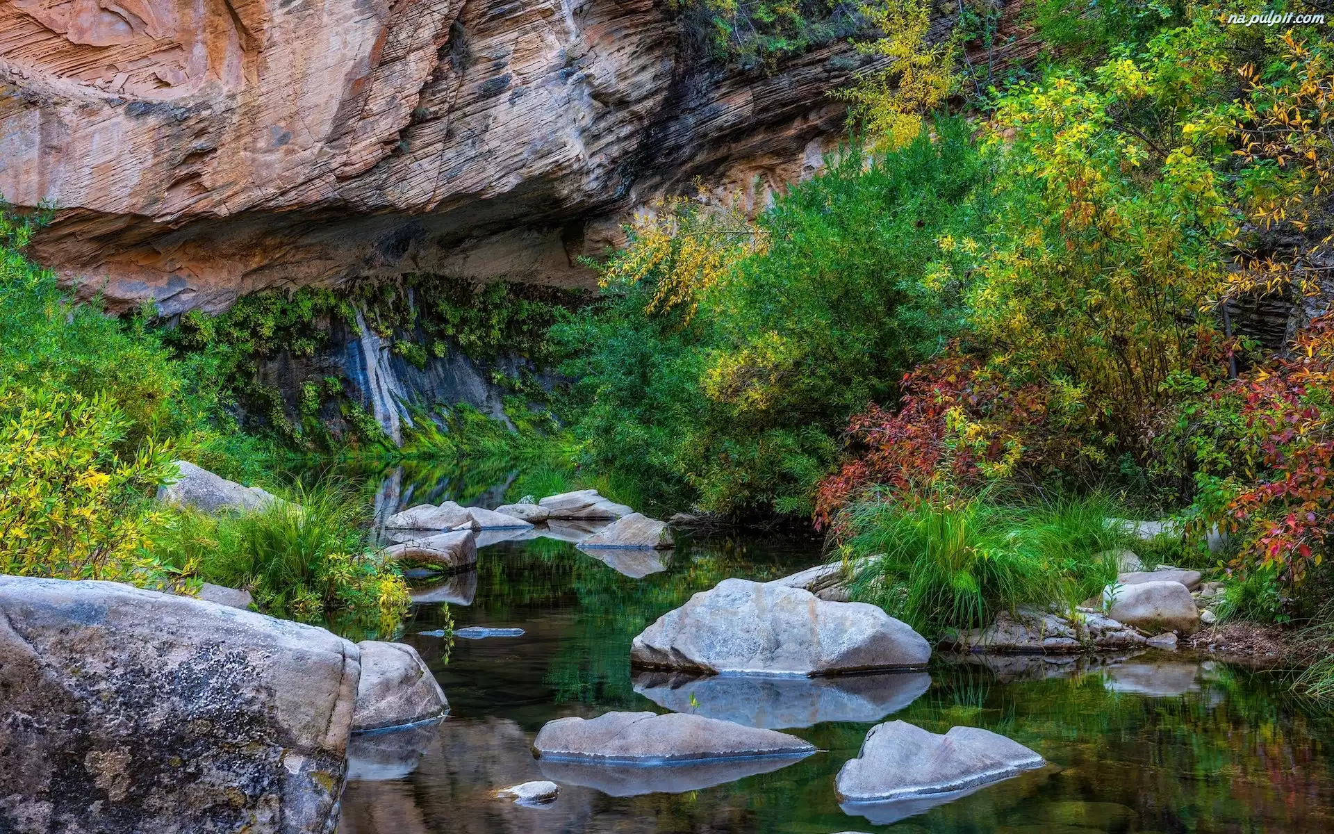 Kamienie, Rzeka, Sedona, West Fork Oak Creek, Stany Zjednoczone, Arizona, Drzewa, Skały Na Pulpit