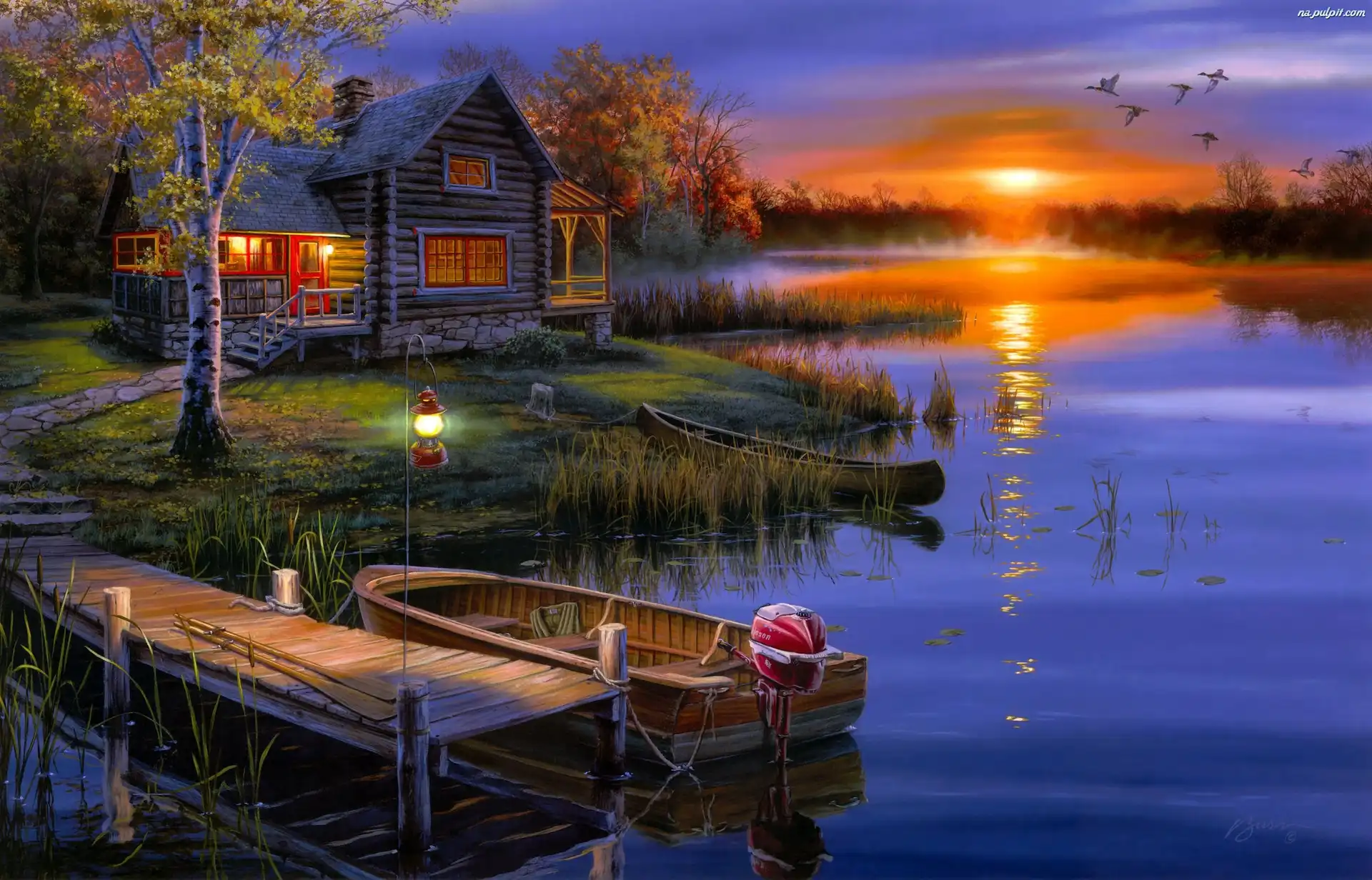 Art, Dom, Jezioro, Łódź Na Pulpit