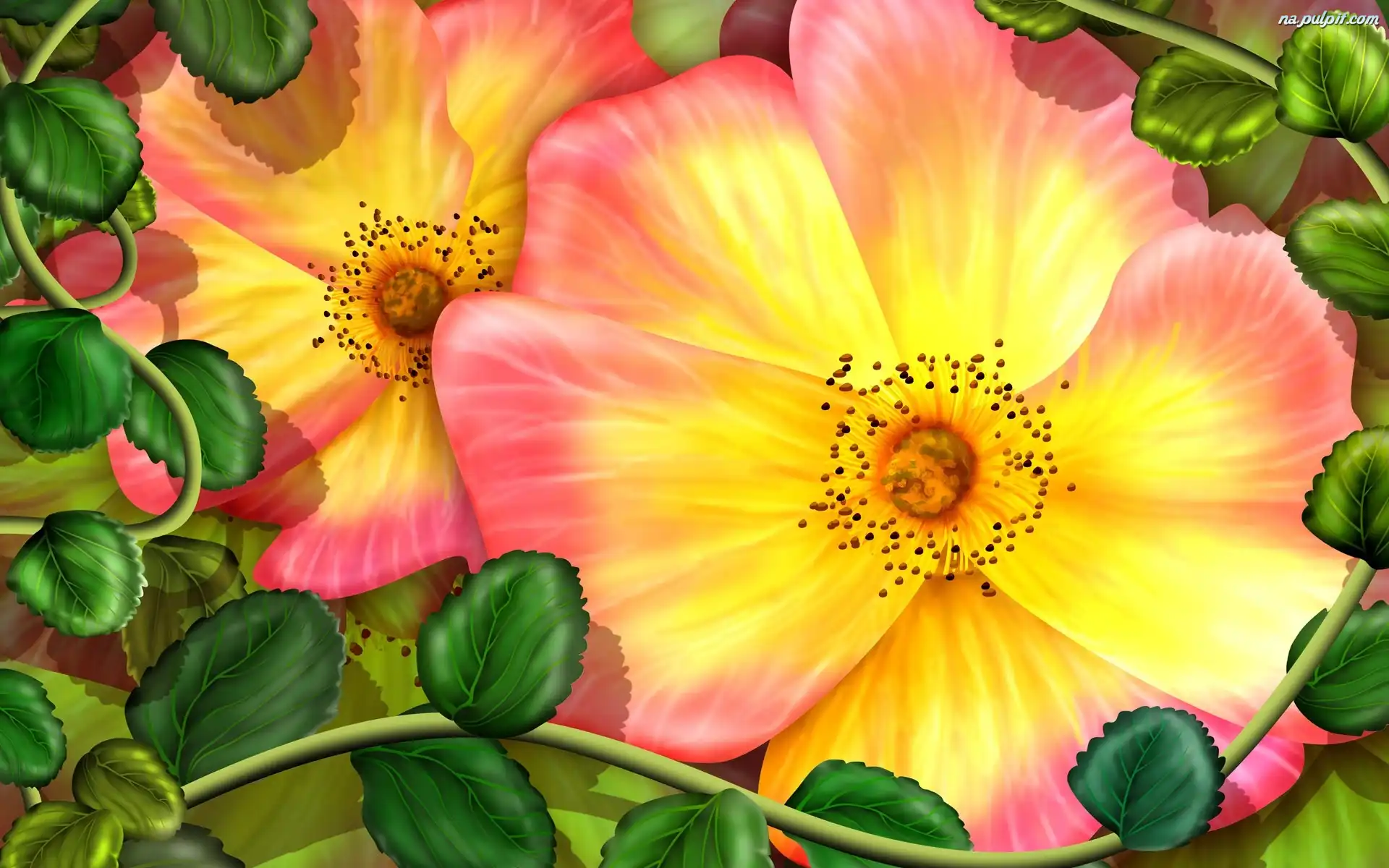 Art, Kwiatki, Różowe, Żółto, Liście Na Pulpit