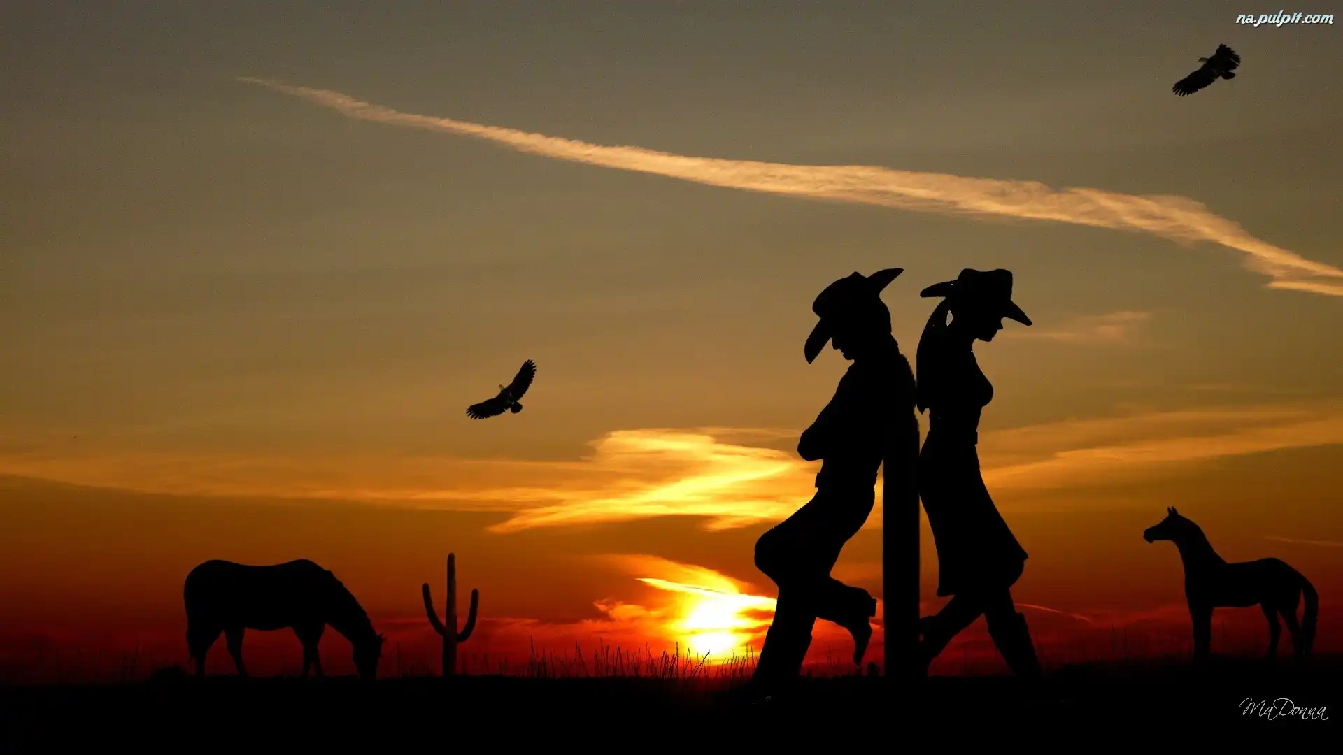 Art, Zachód, Konie, Para, Słońca Na Pulpit