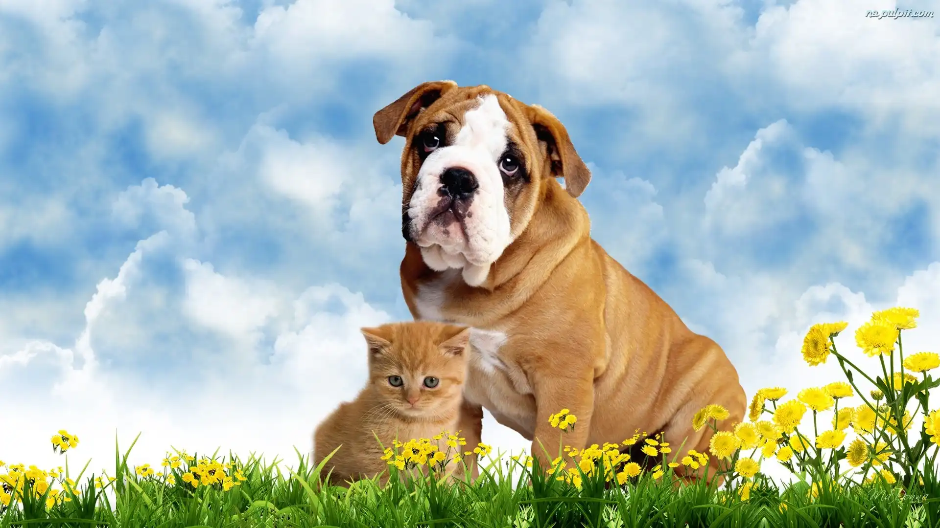 Art, Niebo, Kot, Pies, Trawa