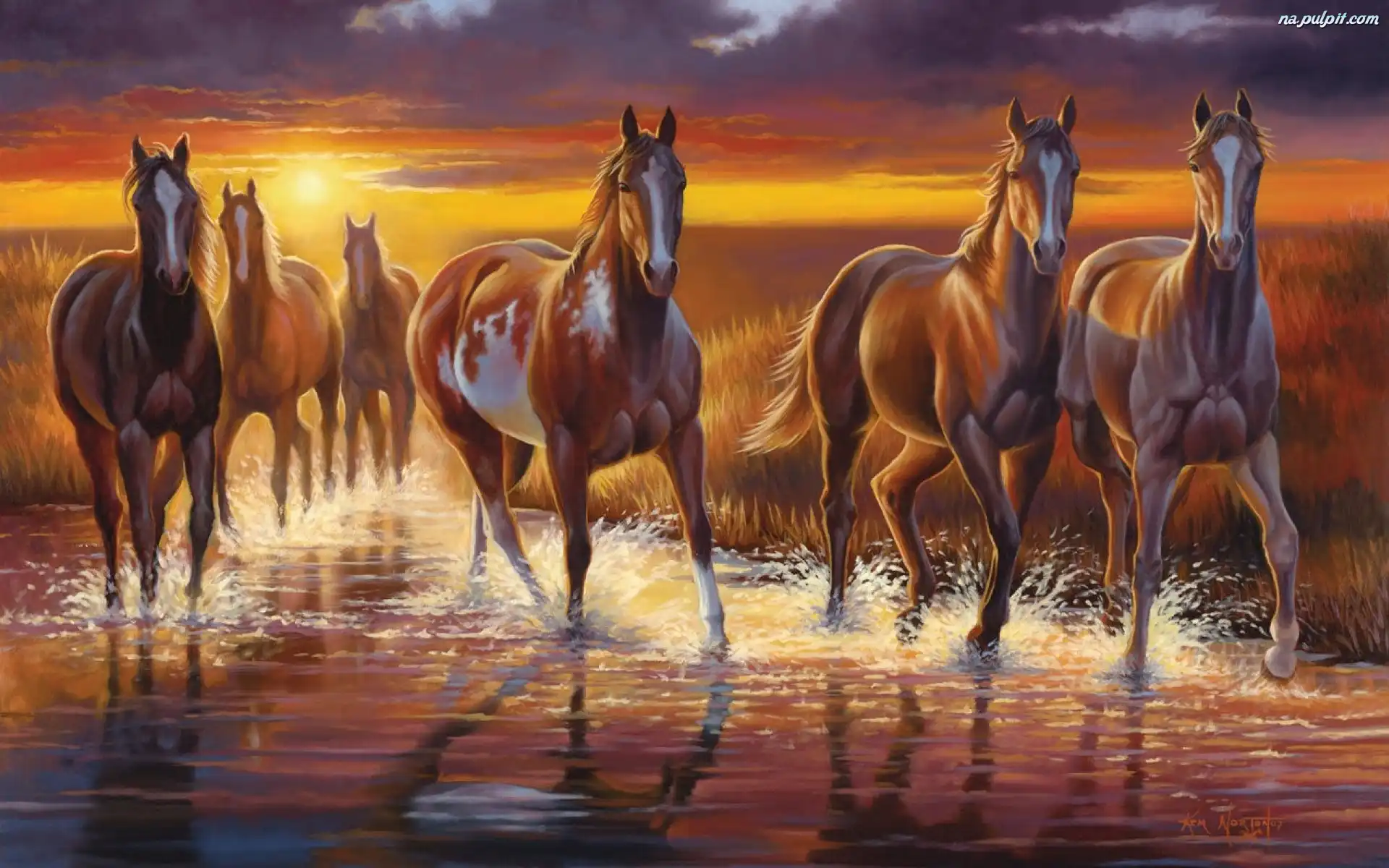Art, Konie, Słońca, Zachód, Woda Na Pulpit