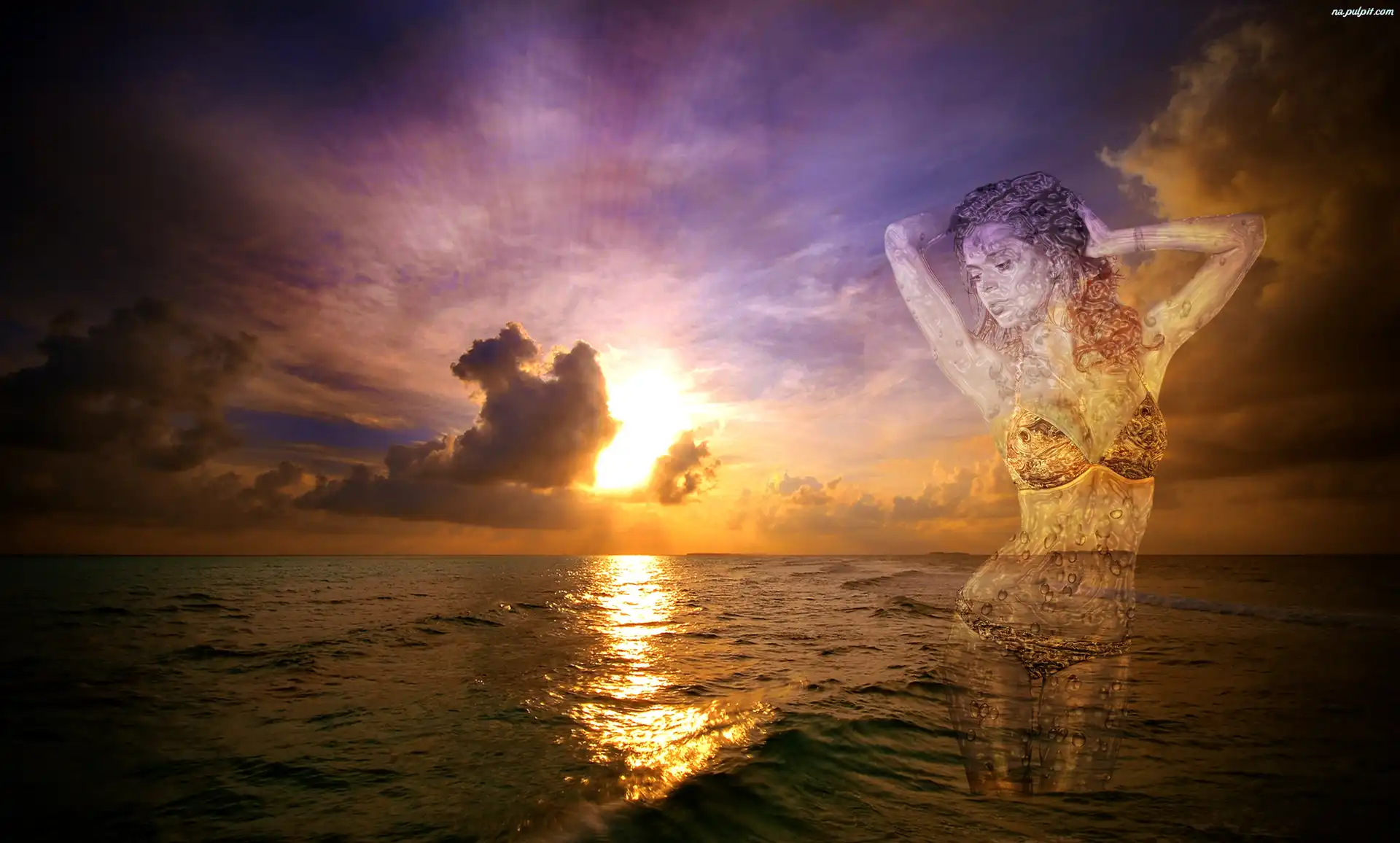 Art, Morze, Słońca, Zachód, Kobieta Na Pulpit