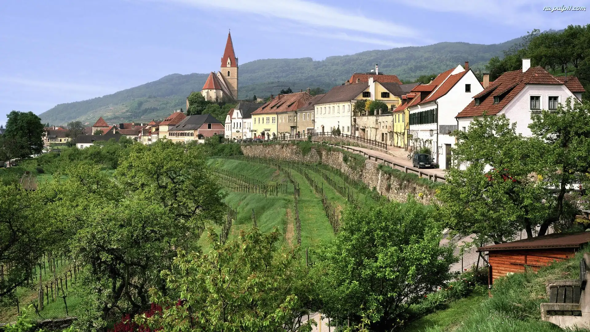 Austria, Drzewa, Domy, Kościół, Trawy Na Pulpit